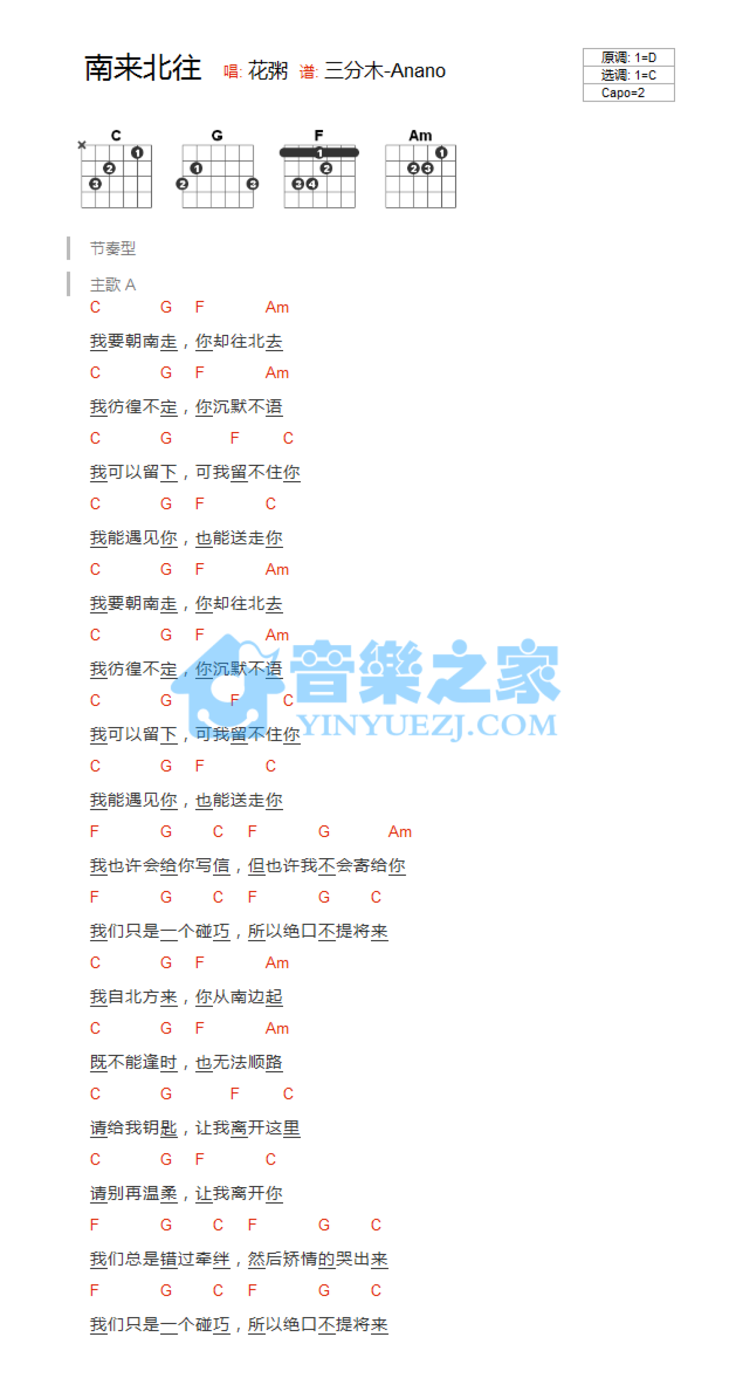 南来北往吉他谱 - 花粥 - C调吉他弹唱谱 - 和弦谱