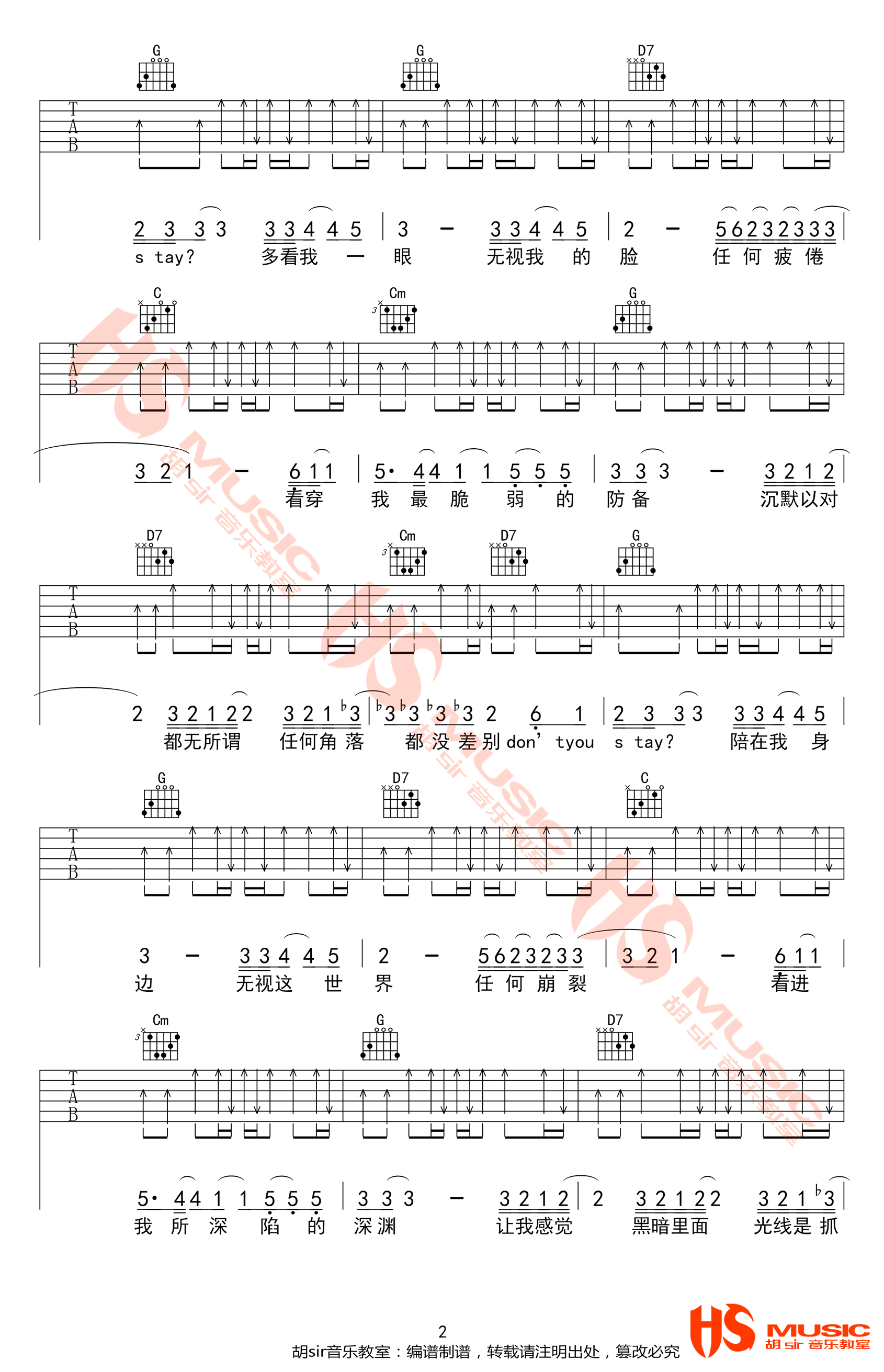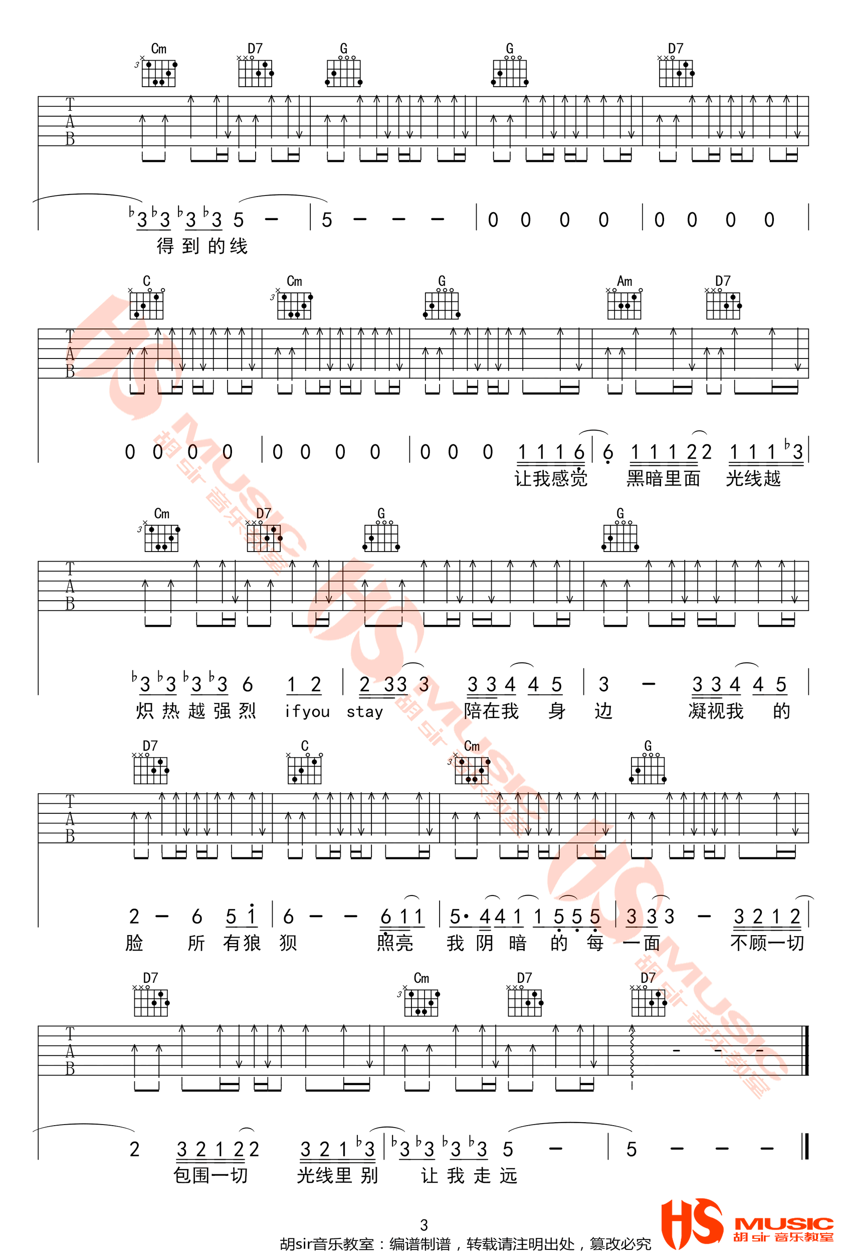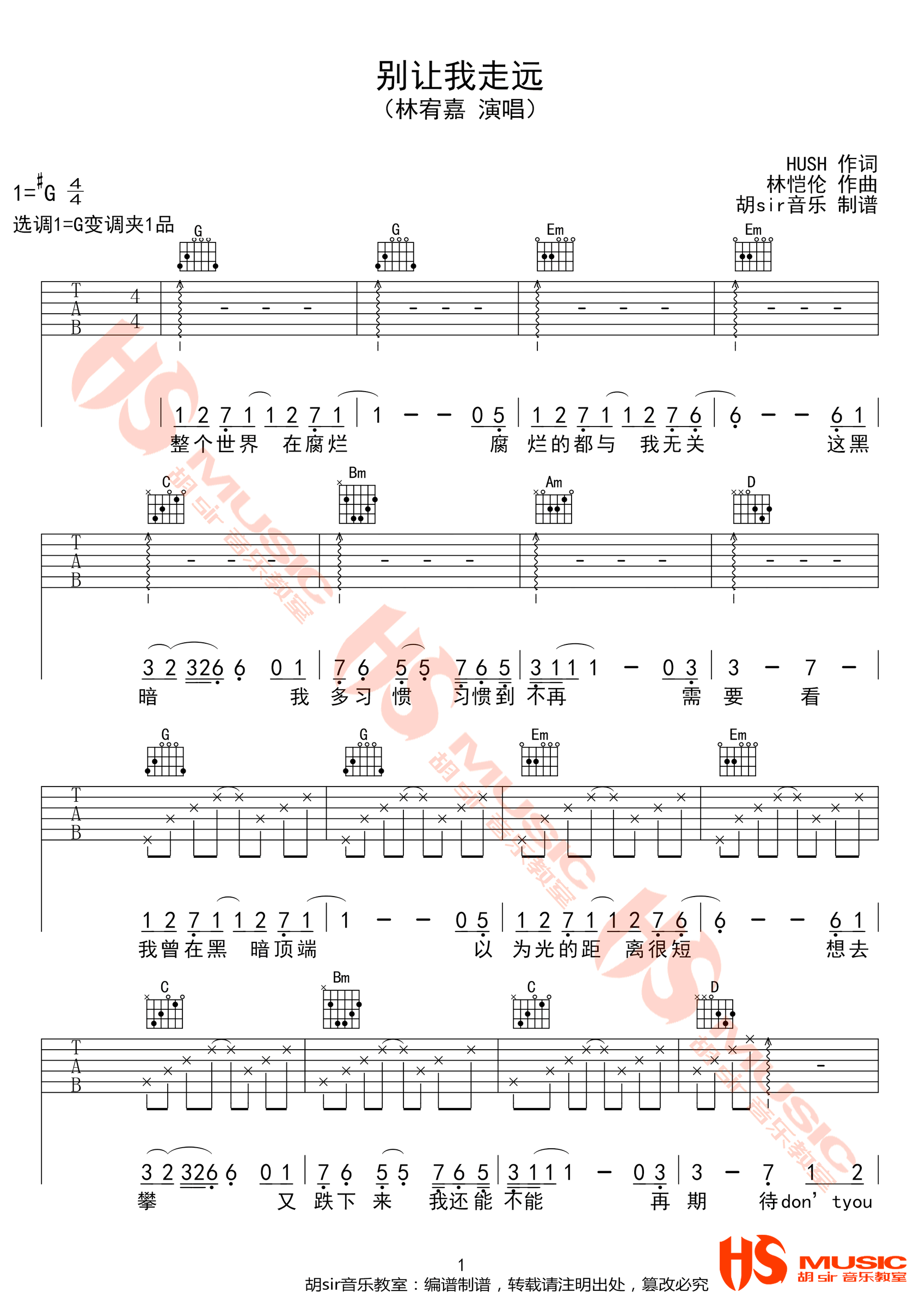 曲谱介绍: 《别让我走远》吉他谱_林宥嘉_G调弹唱六线谱_高清图片谱分享,这是一首来自林宥嘉演唱的新歌《别让我走远》,这首歌也同时作为了电视剧《我们与恶的距离》里面的主题曲,一首非常好听的单曲。 此版本的曲谱来源于胡sir吉他教室,歌曲原调为#G调,这里采用G调指法根据原版编配,演唱时夹变调夹1品,曲谱非常简单,前奏就几个和弦的琶音,后面只有一个Cm和弦的大横按较难按。 《别让我走远》吉他谱_林宥嘉_G调弹唱六线谱_高清图片谱1: