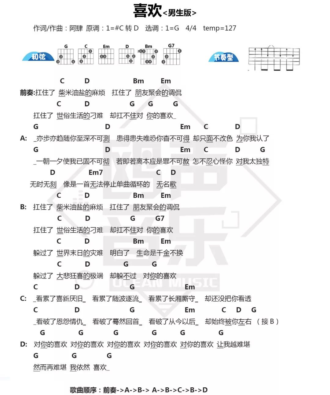 曲谱介绍: 喜欢吉他谱_阿肆_《喜欢》G调简单版弹唱谱_高清和弦图谱分享,这是一首由阿肆作词作曲并演唱的歌曲《喜欢》,节奏非常活泼、轻快,喜欢一个人本有苦有涩,但是听这首歌,我们不会再感到喜欢一个人的苦涩了。 此版本的曲谱来源于网络,歌曲原调为#C,最后有个转调到D调,这里采用G调指法编配制谱,谱子上左手和弦和右手节奏型都已经标注,如果不明白的朋友,戳下方加入群聊吧。 喜欢吉他谱_阿肆_《喜欢》G调简单版弹唱谱_高清和弦图谱: