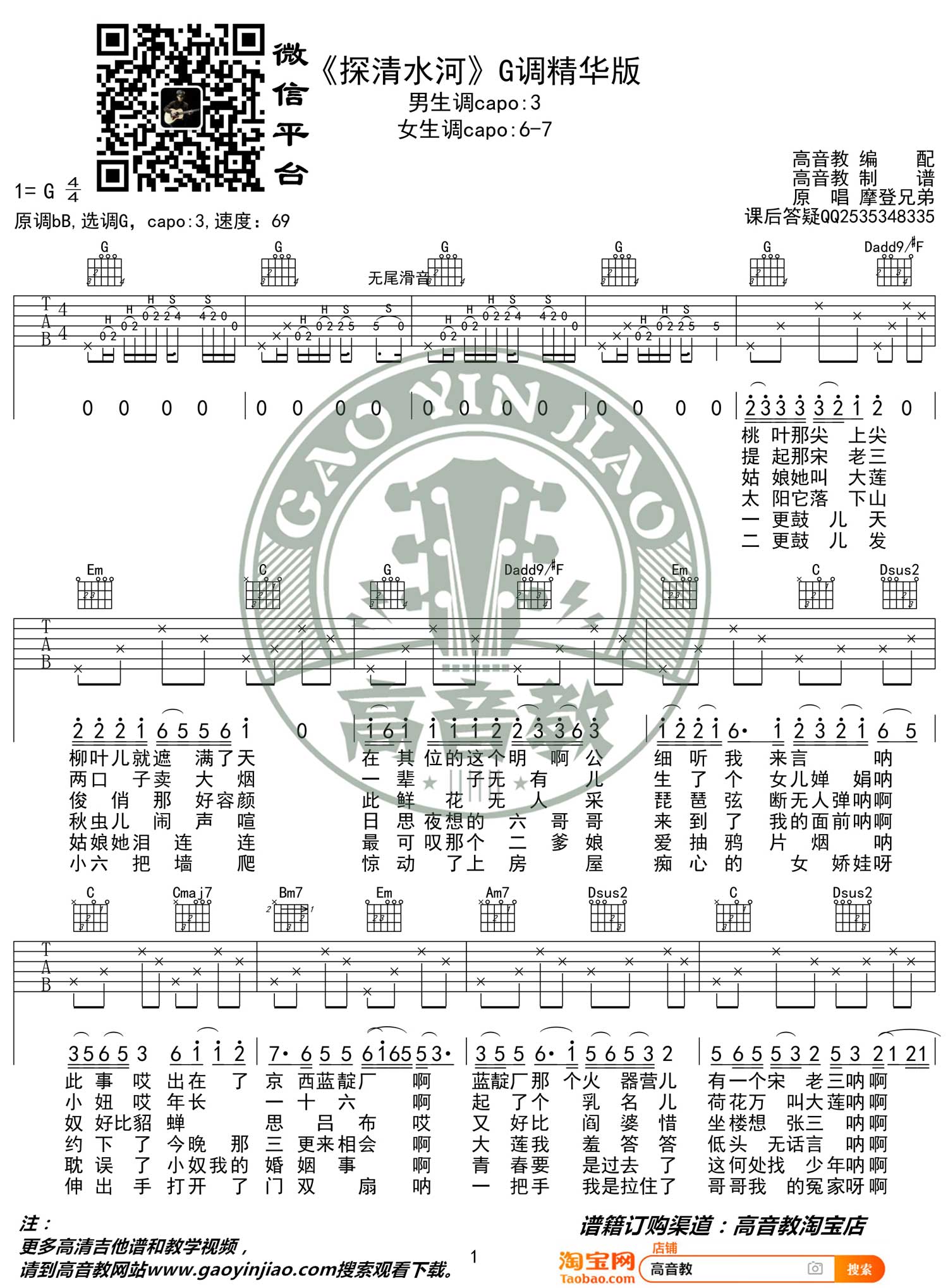 曲谱介绍: 《探清水河》吉他谱_摩登兄弟_G调精华版弹唱六线谱_图片谱分享,《探清水河》这首歌由摩登兄弟演唱,是一首地道的京味儿小曲儿,晓月老板和张云雷也演唱过,不同的人唱由不同的风格,你更喜欢哪个? 此版本的曲谱来源于高音教扒谱制谱,歌曲原调为降B调,这里采用G调指法根据摩登兄弟版本编配,前奏和尾奏指法略微复杂,另外后面应该有个转调,这里省略掉了。 《探清水河》吉他谱_摩登兄弟_G调精华版弹唱六线谱_图片谱1: