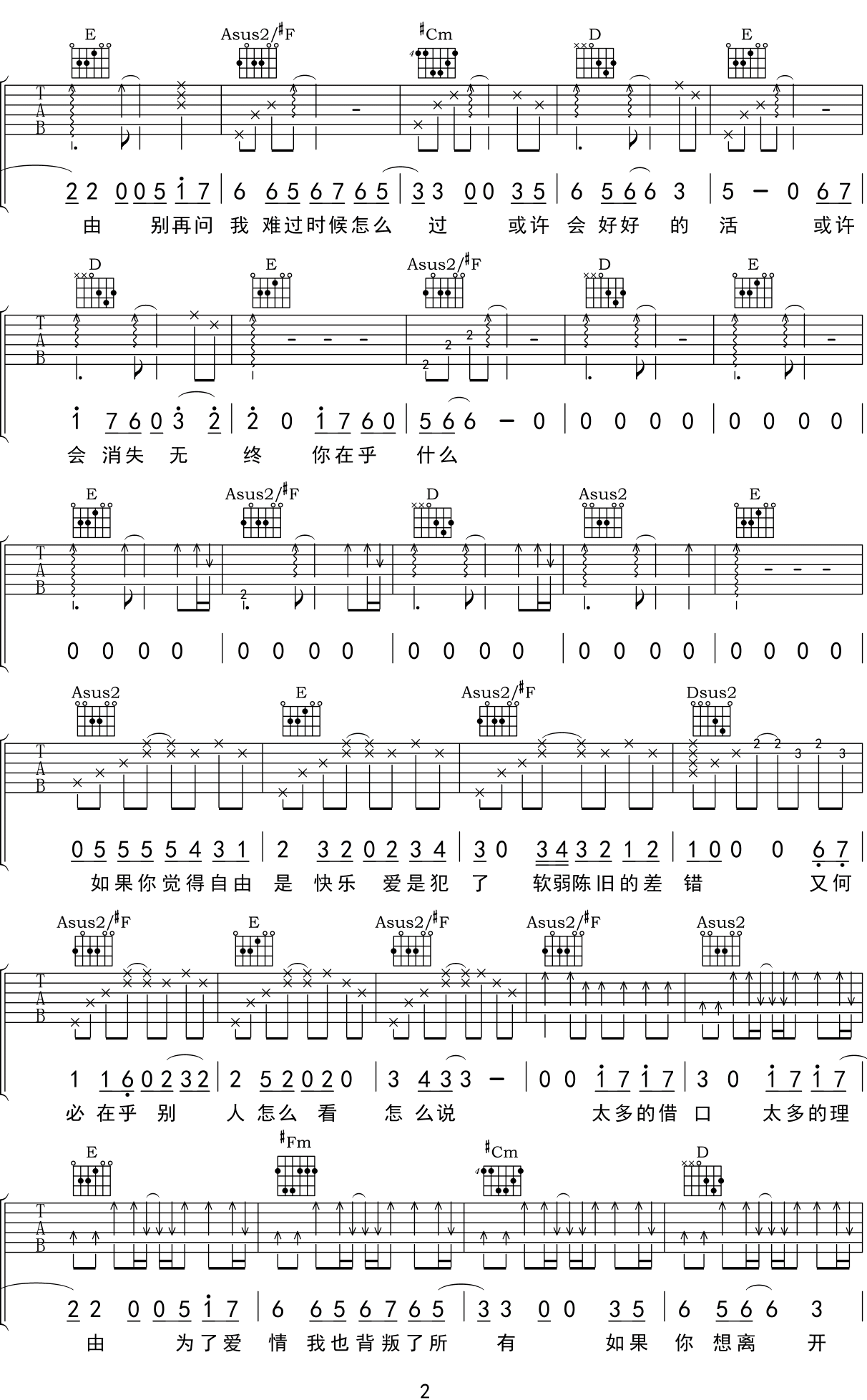 曲谱介绍: 太多吉他谱_阿冗_《太多》A调原版弹唱六线谱_高清图片谱分享,《太多》这首歌原为歌手陈冠蒲演唱演唱的一首情歌,后被阿冗翻唱,又引起很多网友的喜好,同一首歌,不同的诠释,非常好听的一首歌。 此版本的曲谱来源于群内一位朋友,歌曲原调为降B调,这里采用A调指法根据原版进行编配,演唱时夹变调夹1品。曲谱虽然比较长,但是指法和和弦都是比较简单的。 太多吉他谱_阿冗_《太多》A调原版弹唱六线谱_高清图片谱1-2: