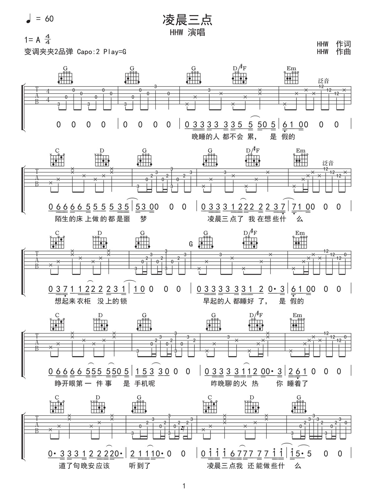 曲谱介绍: 《凌晨三点》吉他谱_HHW_G调原版弹唱六线谱_高清图片谱分享,《凌晨三点》这首歌是由HHW创作并演唱的一首民谣歌曲,声音低沉深邃,也是我第一次听就开始喜欢的一首歌。 此版本的曲谱来源于群内琴友分享,曲谱版权归原作者所有。歌曲原调为A调,这里采用G调指法根据原版进行编配,这首歌有一定难度,使用了泛音技巧,还有一些比较复杂的节奏和旋律音,需要好好练习。 《凌晨三点》吉他谱_HHW_G调原版弹唱六线谱_高清图片谱1: