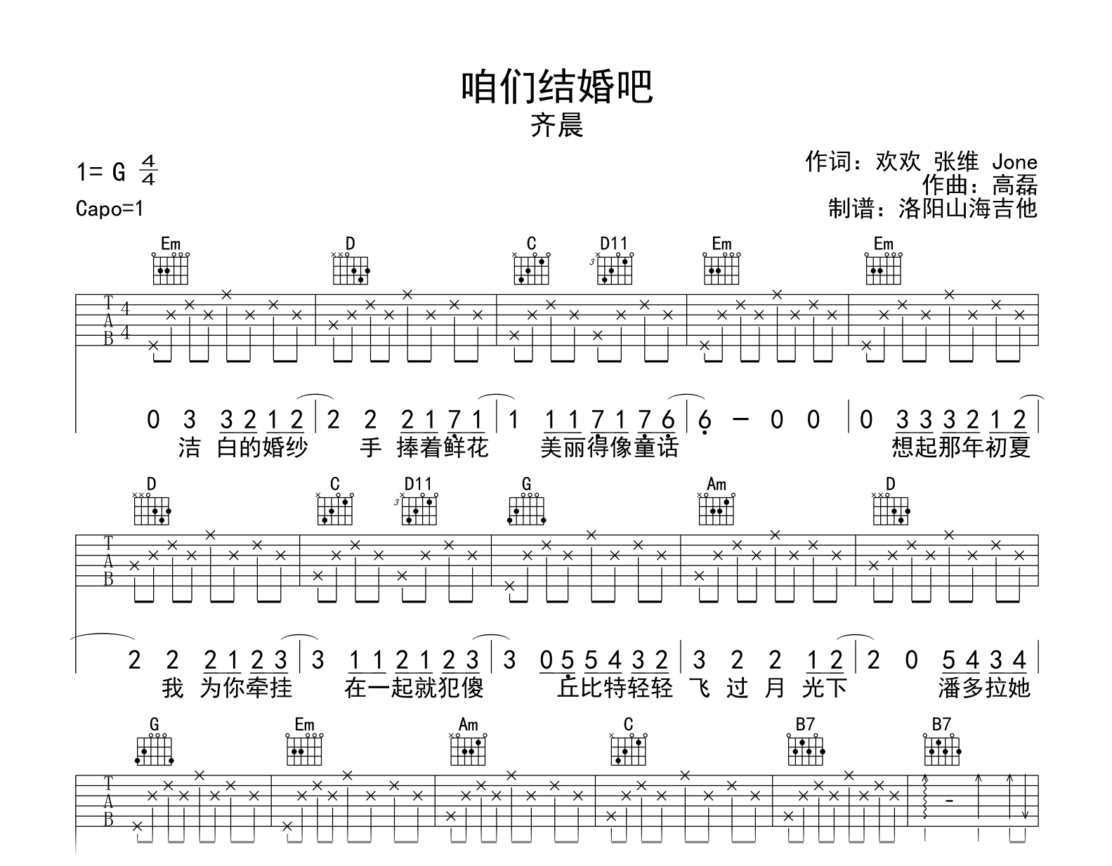 曲谱介绍: 咱们结婚吧吉他谱,齐晨演唱,洁白的婚纱,手捧着鲜花,美丽得像童话。《咱们结婚吧》吉他弹唱谱,选用G调和弦指法编配,CAPO夹一品,高清图片共两张六线谱。