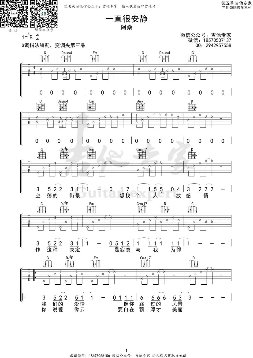 曲谱介绍: 吉他谱介绍:一直很安静吉他谱,阿桑演唱的一首歌曲,4/4拍的节奏,这首歌曲的原调为降B调,这里曲谱采用了G调指法进行编配,演唱时夹变调夹3品可回到原调,也可根据个人实际嗓音情况选择。曲谱由琴谱网更新上传,共3张高清图片弹唱吉他谱例,来源于@吉他专家编配出品。这首歌是电视剧《仙剑奇侠传》的插曲,林月如为了拯救逍遥和灵儿的生命去了,最后阿桑也去了,不得不说令人感伤。她走得很安静,漂泊在安静的最美境界里。