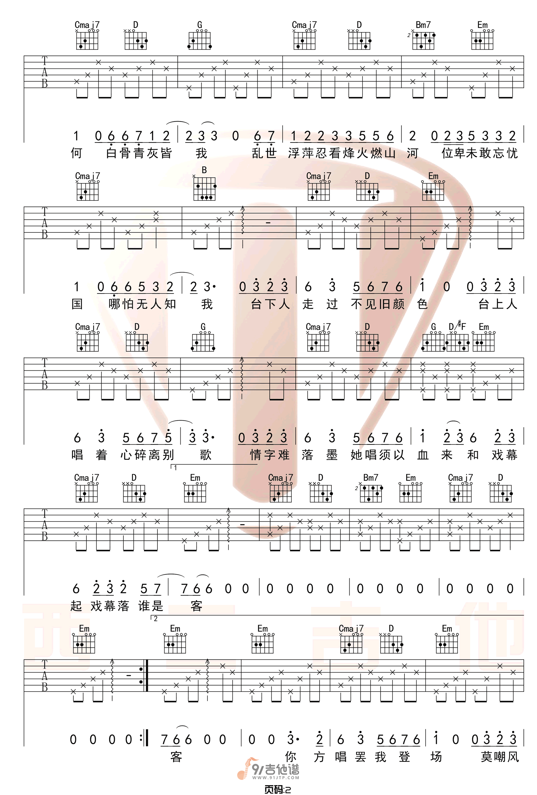 曲谱介绍: 曲谱简介:赤伶吉他谱,HITA演唱的一首歌曲,4/4拍的节奏,这首歌曲的原调为B调,这里曲谱采用了G调指法进行编配,演唱时夹变调夹4品可回到原调,也可根据个人实际嗓音情况选择。曲谱由西二吉他编配出品。这是一首为古代戏子(伶人)正名的歌,歌中穿插昆曲《桃花扇》的唱腔一出简直给人深厚的滋养,那浓厚的国风和古风让人莫名的痴爱。