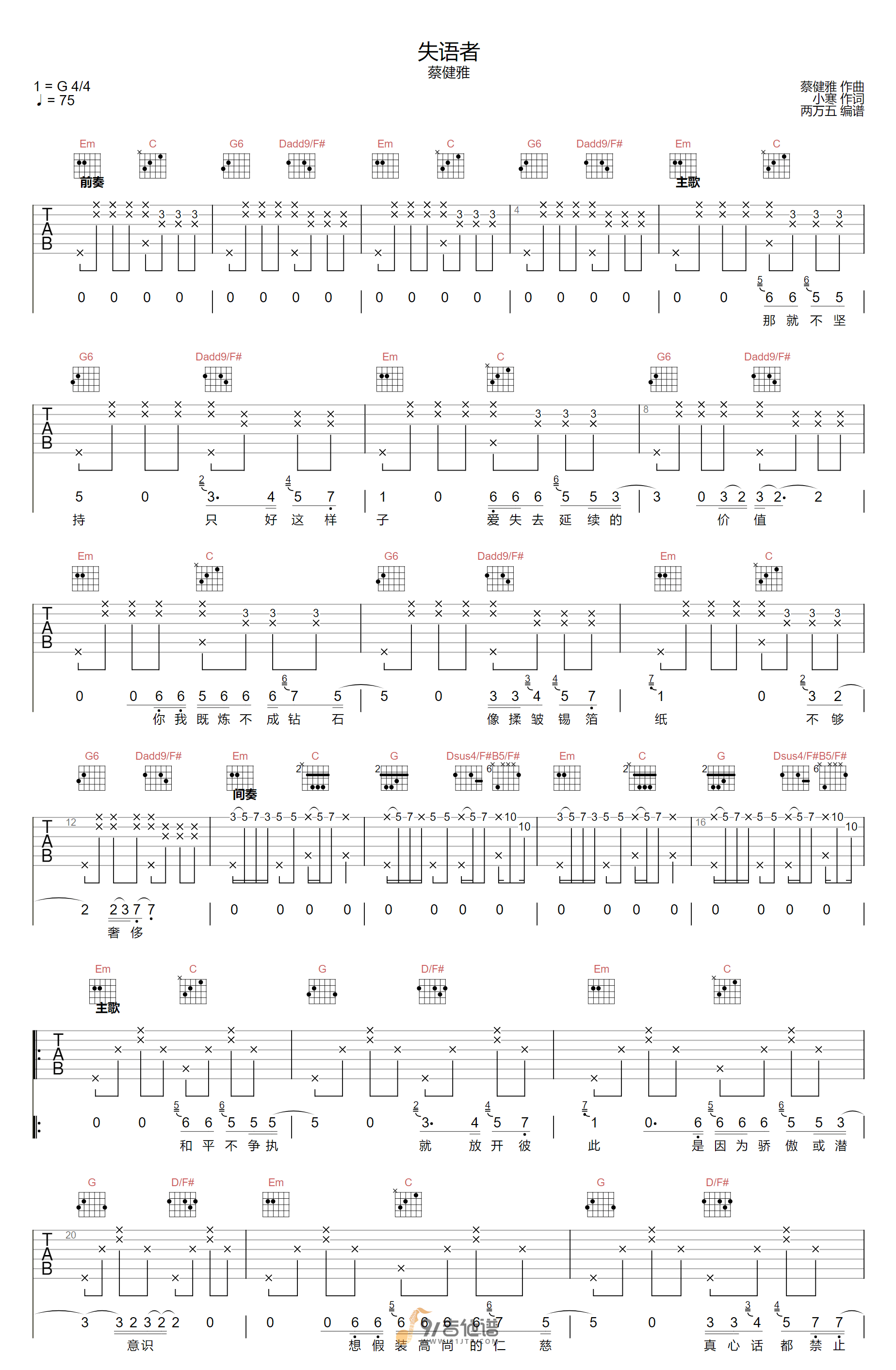 失语者吉他谱 - 蔡健雅 - G调吉他弹唱谱 - 原版
