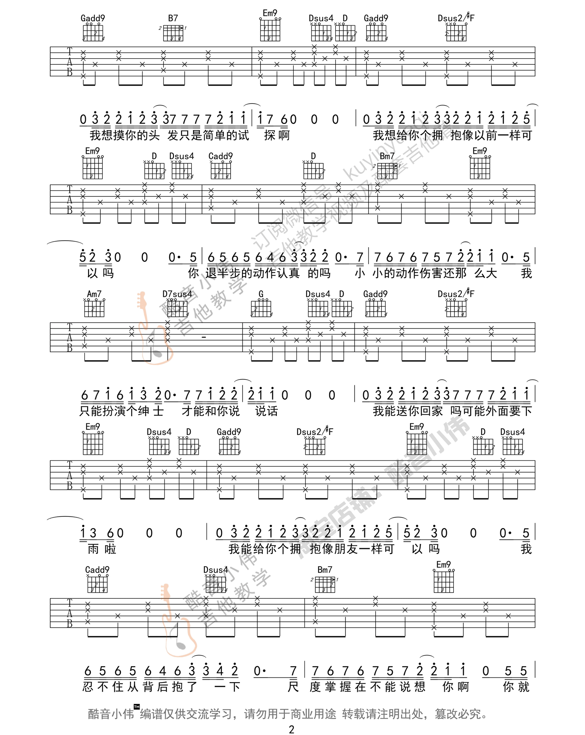 曲谱介绍: 绅士吉他谱_薛之谦_《绅士》G调原版弹唱六线谱_高清图片谱分享,《绅士》这首歌由薛之谦包揽词曲创作并演唱,该曲旋律舒缓,歌词深情,让听众听到带有薛之谦特色的“薛氏情歌”,用极限来诠释伤悲的爱情寓言。 此版本的曲谱来源于酷音小伟扒谱制谱,歌曲原调为#C调,这里采用G调指法编配,男生建议夹变调夹2-6品演唱。曲谱有一定难度,后面有一个G转A调,换成A调指法及和弦弹奏。 绅士吉他谱_薛之谦_《绅士》G调原版弹唱六线谱_高清图片谱1: