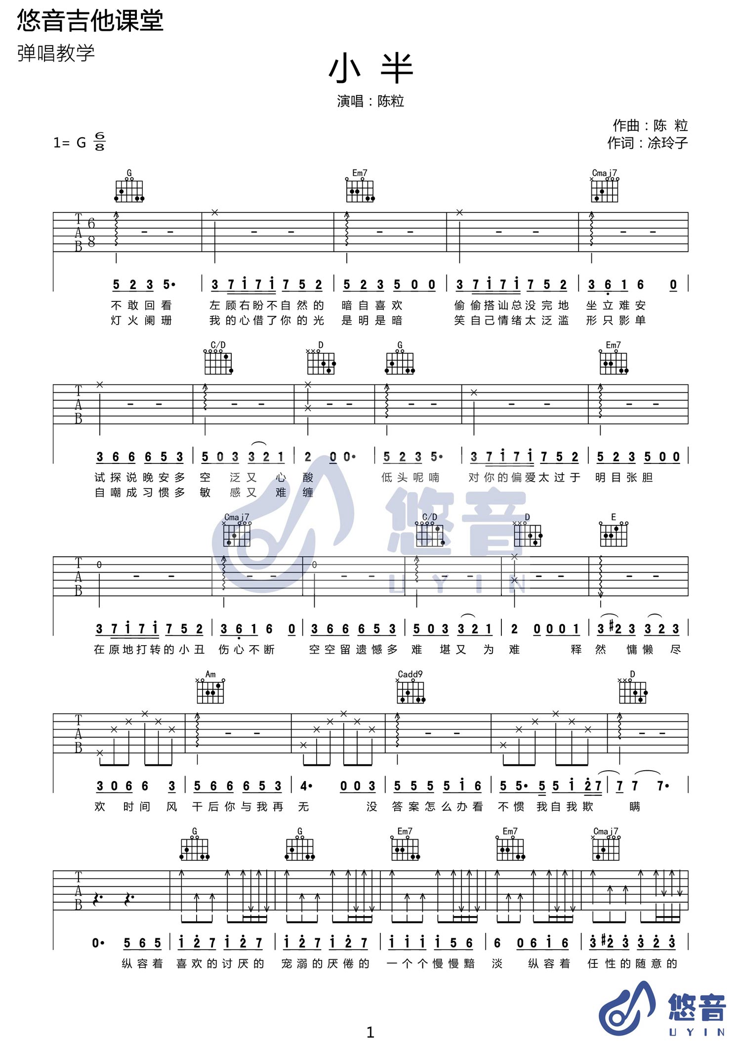 曲谱介绍: 小半吉他谱_陈粒_《小半》G调原版六线谱_吉他弹唱教学分享,《小半》这首歌由陈粒作曲并演唱,是写给那些心里已有爱意,却不知如何把爱告诉对方的那群人。在尚未发行前,这首歌就已在好妹妹万人体育场演唱会现场抢先曝光。 此版本的曲谱及教学来源于悠音吉他,这里采用G调指法根据原版进行编配。前面部分比较简单,也是遵循了原版伴奏,采用几个琶音作为开头,后面的扫弦节奏型使用了三连音,这里的节奏需要好好体会一下。 小半吉他谱_陈粒_《小半》G调原版六线谱_吉他弹唱教学视频:   小半吉他谱_陈粒_《小半》G调原版吉他弹唱六线谱_高清图片谱1: