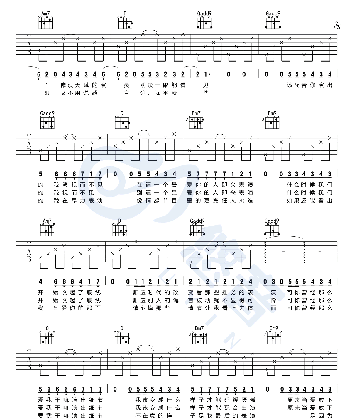 曲谱介绍: 演员吉他谱_薛之谦_《演员》G调原版六线谱_吉他弹唱教学分享,《演员》是由薛之谦作词作曲并演唱的一首歌。薛之谦以“在爱情面前,我不是一位演员,但愿成为一名绅士”为创作理念,将局外人拉入“薛氏情歌”的纠结情感中。 此版本的曲谱及教学来源于悠音吉他,这里歌曲采用G调指法根据原版进行编配,演唱时可以根据自己嗓音情况夹变调夹,因为这首歌的音域比较广,不太好唱,整体偏简单,如果有不清楚的可以参考吉他弹唱教学视频。 演员吉他谱_薛之谦_《演员》G调原版六线谱_吉他弹唱教学视频: 演员吉他谱_薛之谦_《演员》G调原版吉他弹唱六线谱_高清图片谱1-2: