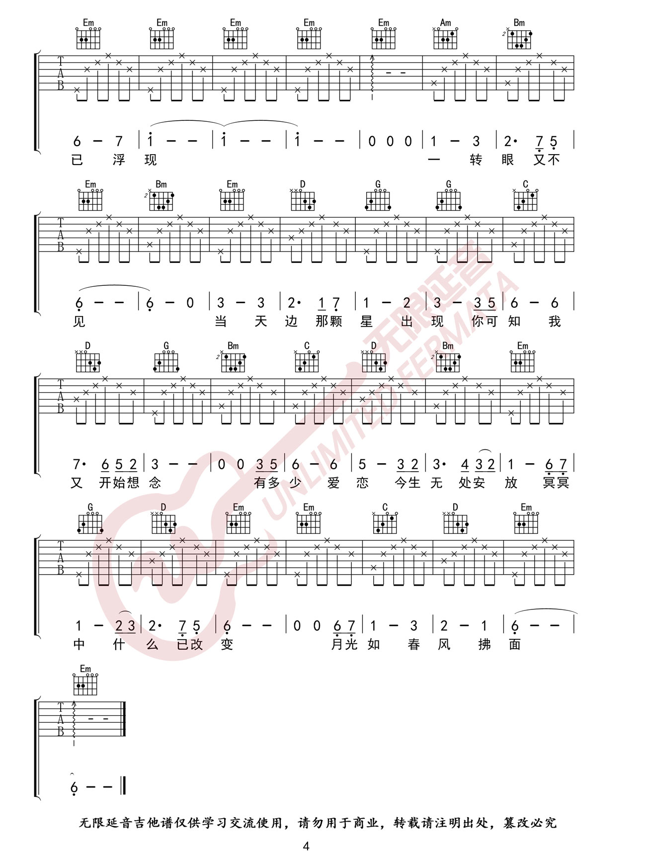 曲谱介绍: 《假如爱有天意》吉他谱_李健_F调弹唱六线谱_高清图片谱分享,《假如爱有天意》这首歌是李健翻唱韩国一部同名电影主题曲,这次李健填的歌词主要也是想表达片中爱情的无奈之美。 此版本的曲谱来源于无限延音包扒谱制谱,歌曲采用F调指法进行编配。在练习这首歌时,右手节奏型并不难,不重要难度在于左手的和弦,F和弦及降B和弦。 《假如爱有天意》吉他谱_李健_F调弹唱六线谱_高清图片谱1-2: