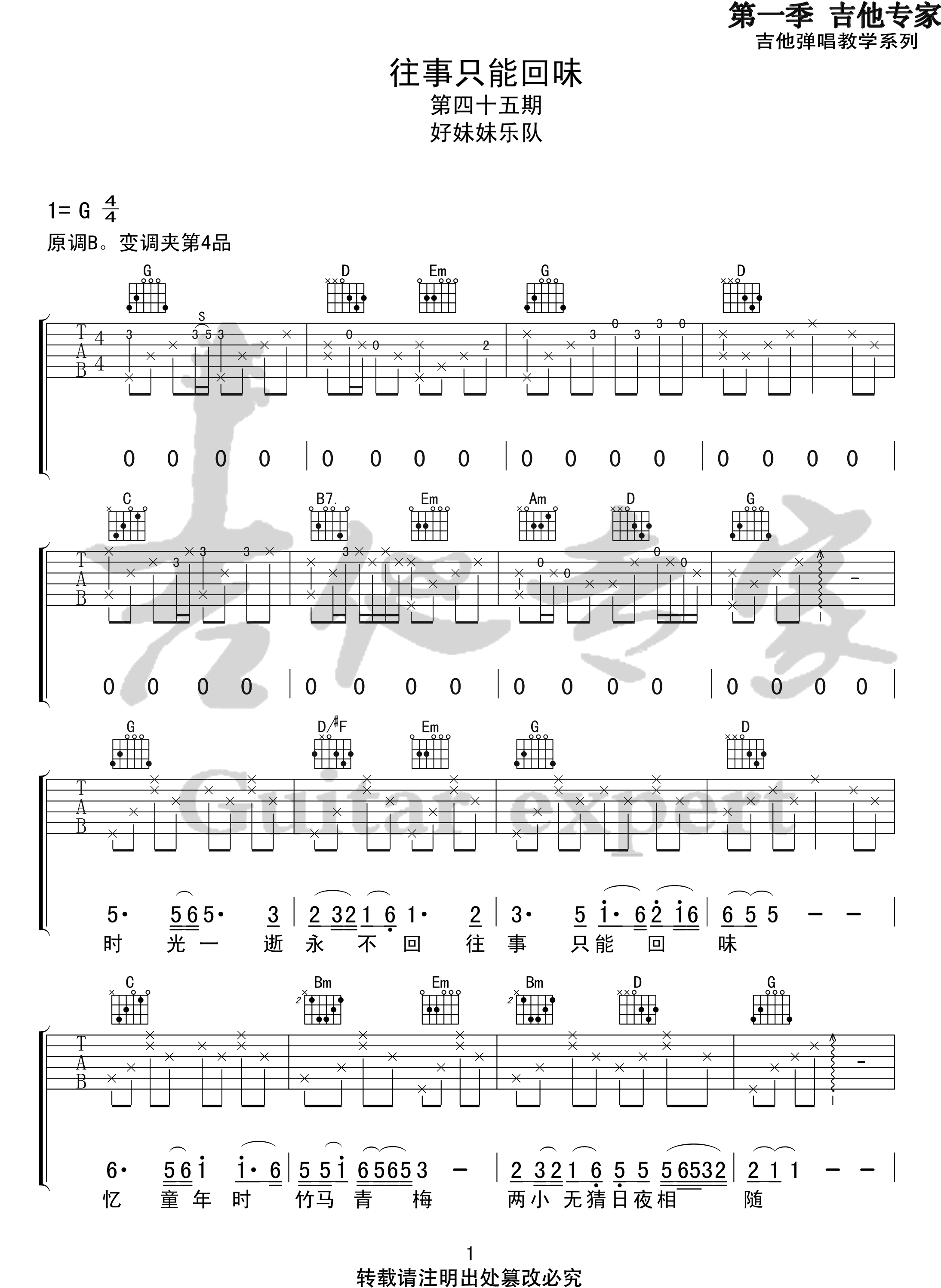 曲谱介绍: 《往事只能回味》吉他谱_好妹妹乐队_G调吉他弹唱六线谱分享,《往事只能回味》这首歌是好妹妹乐队根据经典的老版本改编而来,他们用自己的方式重新诠释了这首歌,来听下这首歌和原版有何不一样的感觉。 此版本的曲谱来源于音艺吉他扒谱制谱,歌曲原调为B调,这里采用G调指法根据原版进行编配,演唱时夹变调夹4品回到原调。全曲没有比较复杂的节奏,唯一需要注意的是前奏部分几个小技巧。 《往事只能回味》吉他谱_好妹妹乐队_G调吉他弹唱六线谱1: