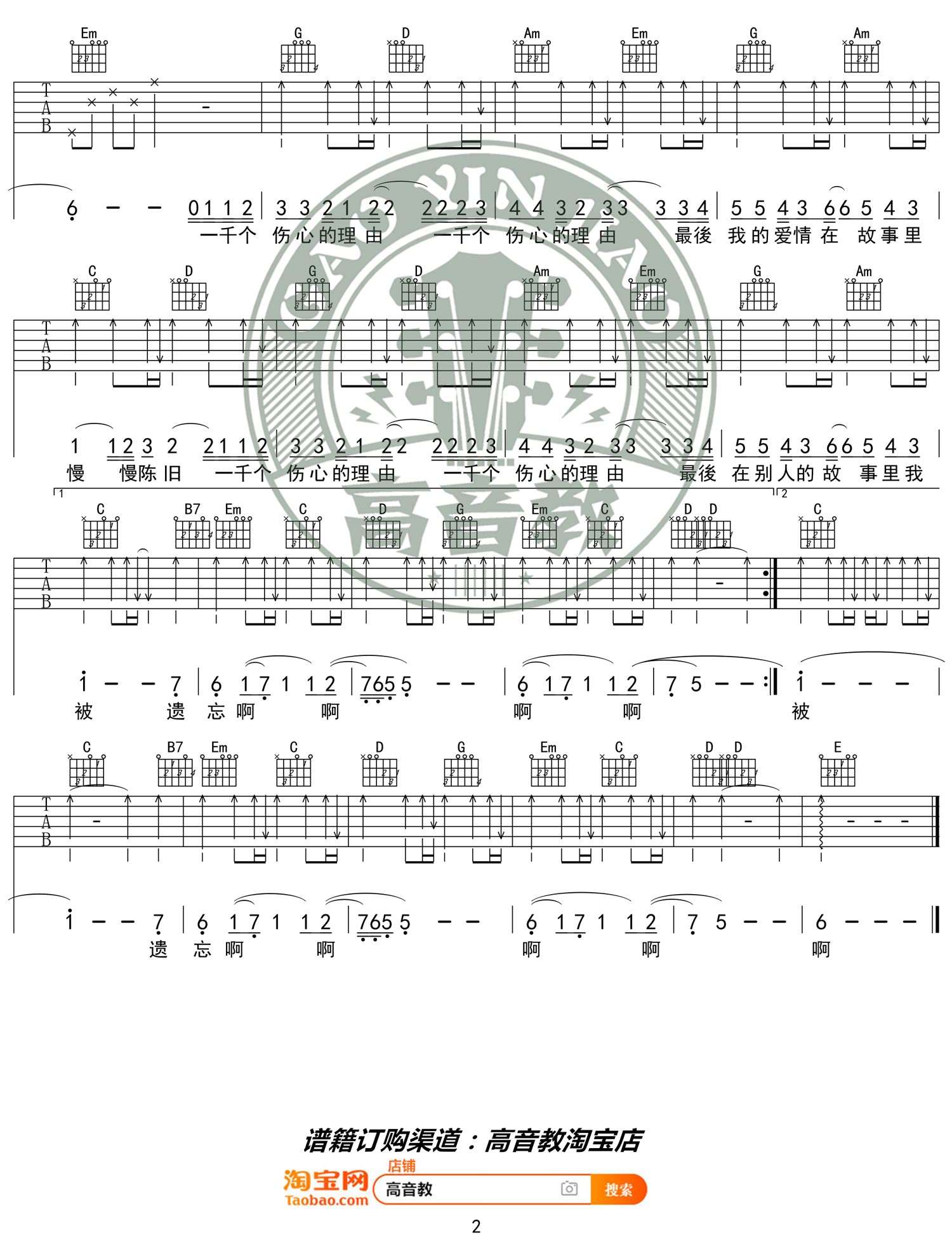 曲谱介绍: 《一千个伤心的理由》吉他谱_张学友_G调简单版弹唱谱_高清六线谱分享,《一千个伤心的理由》是歌神张学友很早期的作品,这首歌承载了我们这一辈对于青春岁月的祭奠,因为每次这首歌的旋律一起来,都会把我们带回到那些回不去的时光里,那些纯真美好的年代一去不复返。 此版本的曲谱来源于高音教扒谱制谱,高清原调为降B和弦,这里采用G调指法进行编配,演唱时夹变调夹3品。全曲使用的和弦都很简单,采用主歌分解和弦副歌扫弦的曲谱结构,难度也不是很大。 《一千个伤心的理由》吉他谱_张学友_G调简单版弹唱谱_高清六线谱1: