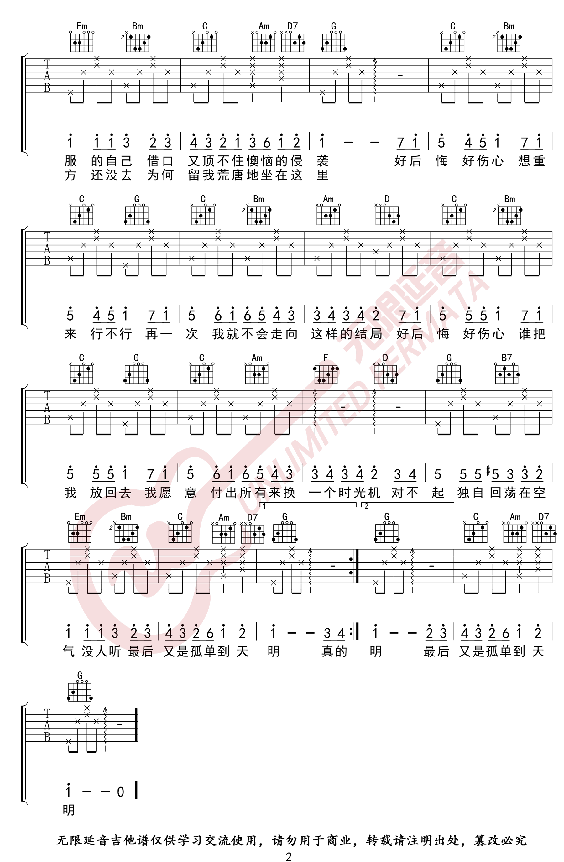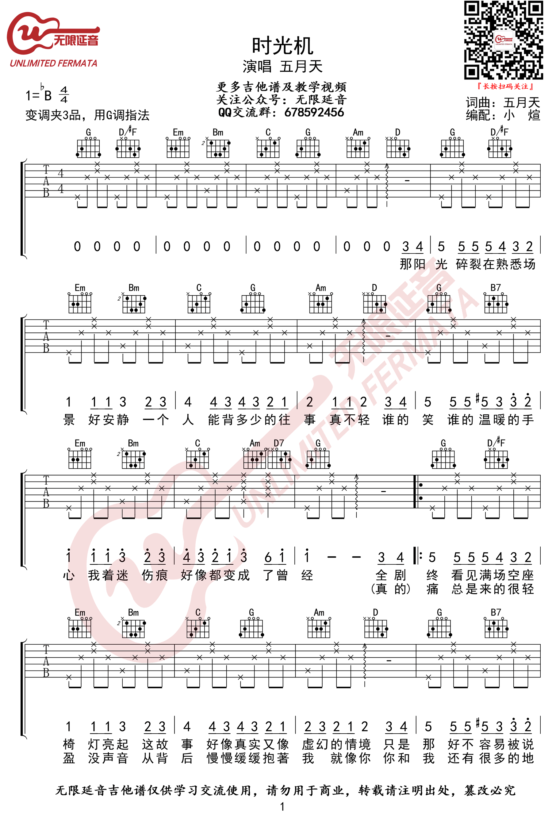 曲谱介绍: 时光机吉他谱_五月天_《时光机》G调原版弹唱谱_高清六线谱分享,《时光机》是由五月天演唱的一首歌,这首歌是五月天复出代表作,表面上看起来,这首歌代表着五月天两年跟歌迷不见的感受,其实是怪兽母亲发病后昏迷,阿信写给他的歌。 此版本的曲谱来源于无线延音扒谱制谱,歌曲原调为降B调,这里采用G调指法根据原版进行编配,演唱时夹变调夹3品。这首歌编配的比较简单,全曲都是采用分解和弦,需要注意一下Bm和弦及D/#F和弦的使用。 时光机吉他谱_五月天_《时光机》G调原版弹唱谱_高清六线谱1:
