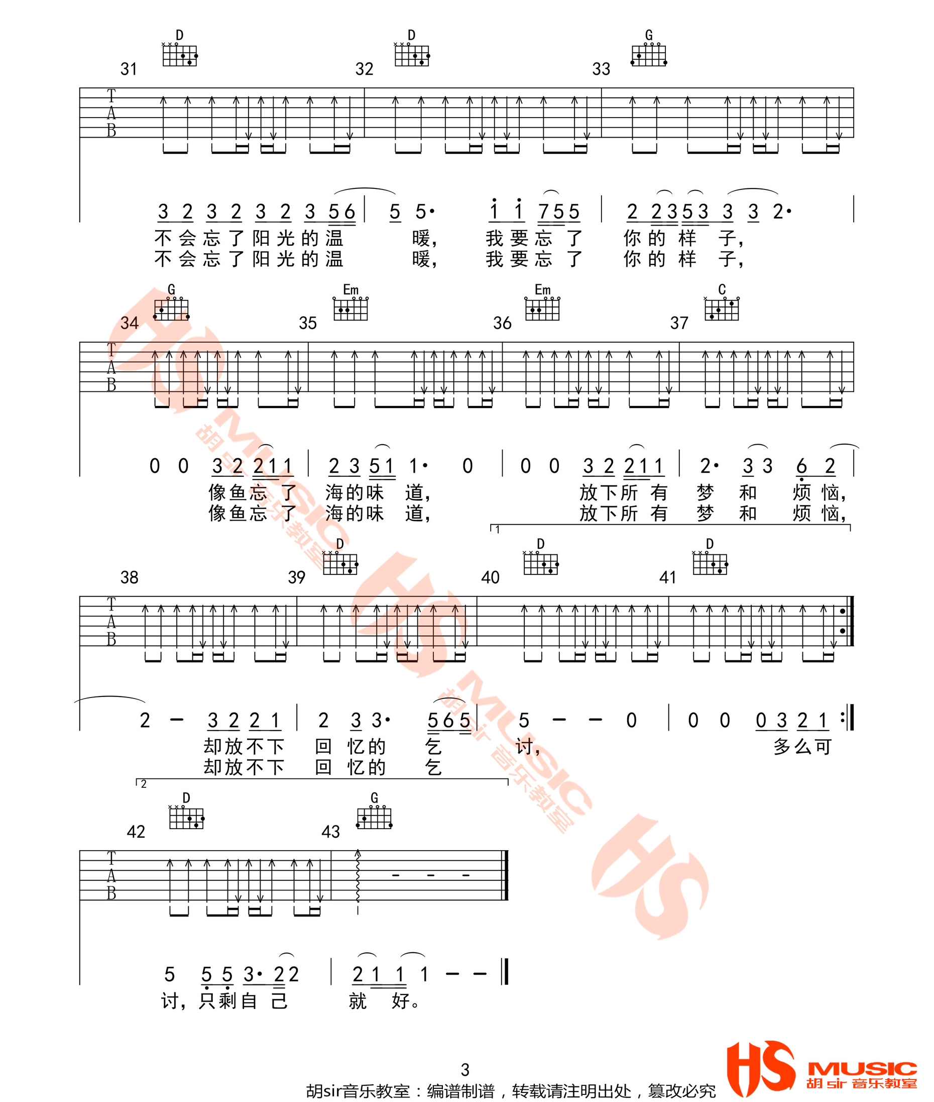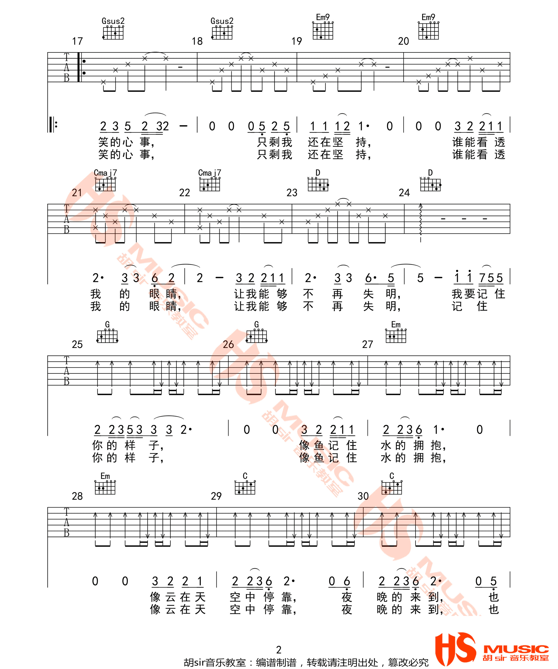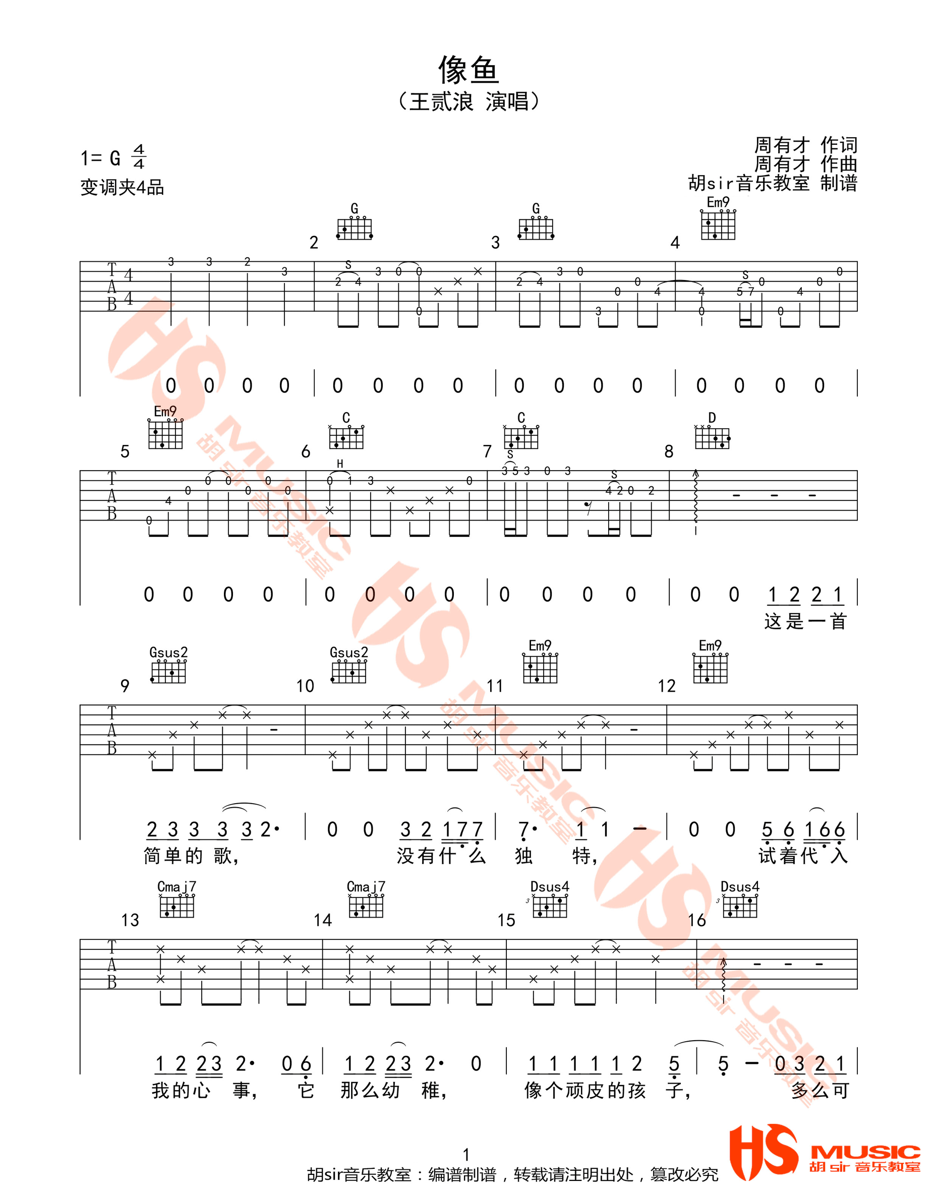 曲谱介绍: 像鱼吉他谱_王贰浪_《像鱼》G调原版弹唱六线谱_高清图片谱分享,《像鱼》是由王贰浪演唱的一首歌曲。人的爱情就像鱼一样自由自在,但却离不开水。当爱情已经不能自在的呼吸,像鱼在水里却活的不快乐,但也无法离开这唯一能生存的介质。 此版本的曲谱来源于胡sir吉他音乐工作室扒谱制谱,歌曲原调为B调,这里采用G调指法根据原版进行编配,演唱时夹变调夹4品。前奏部分是一些旋律音,需要花一定时间练习一下,后面的都比较简单了。 像鱼吉他谱_王贰浪_《像鱼》G调原版弹唱六线谱_高清图片谱1: