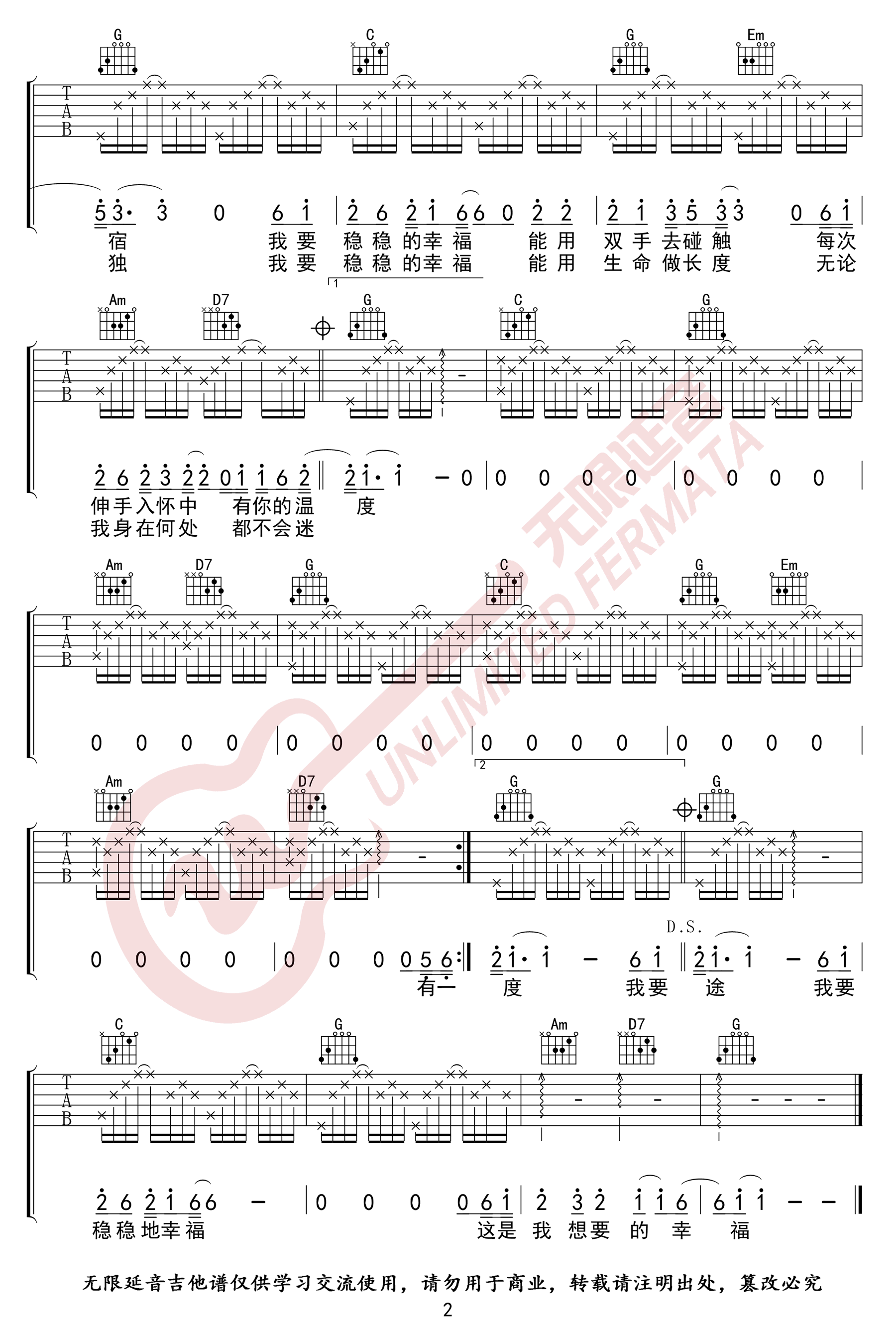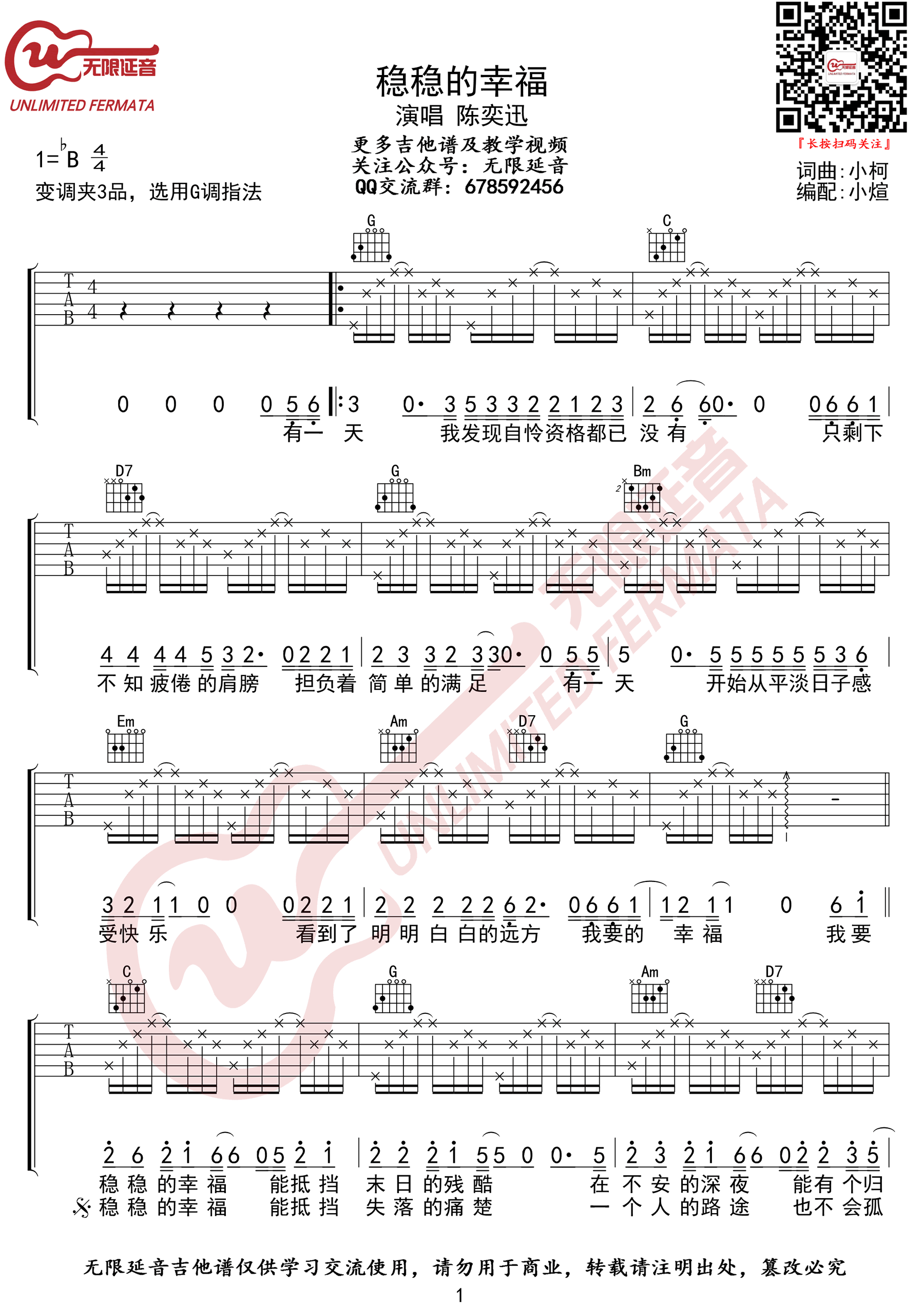 曲谱介绍: 《稳稳的幸福》吉他谱_陈奕迅_G调原版弹唱六线谱_高清图片谱分享,《稳稳的幸福》是由陈奕迅演唱的一首歌,同时这首歌也作为了电影《越来越好之村晚》的主题曲,后来这首歌再次被作为了电视剧《辣妈正传》的主题曲,由孙俪和张译对唱。 此版本的曲谱来源于无限延音扒谱制谱,歌曲原调为降B调,这里采用G调指法根据原版进行编配,演唱时夹变调夹3品回到原调。这首歌原版伴奏为钢琴伴奏,采用分解和弦的形式,这里改为吉他但保留了原版的伴奏方式。 《稳稳的幸福》吉他谱_陈奕迅_G调原版弹唱六线谱_高清图片谱1: