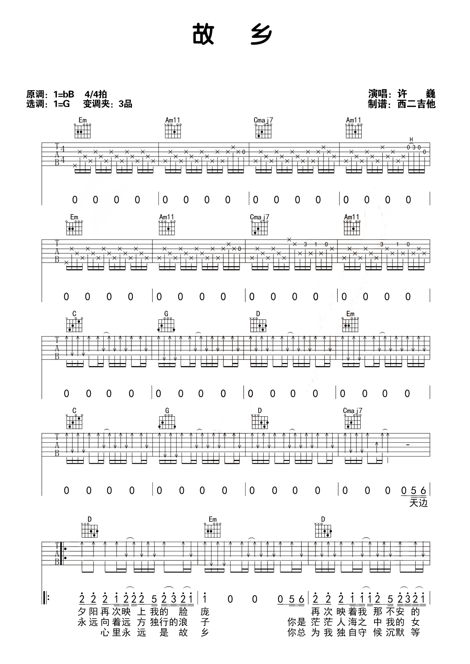 故乡吉他谱 - 许巍 - G调吉他弹唱谱
