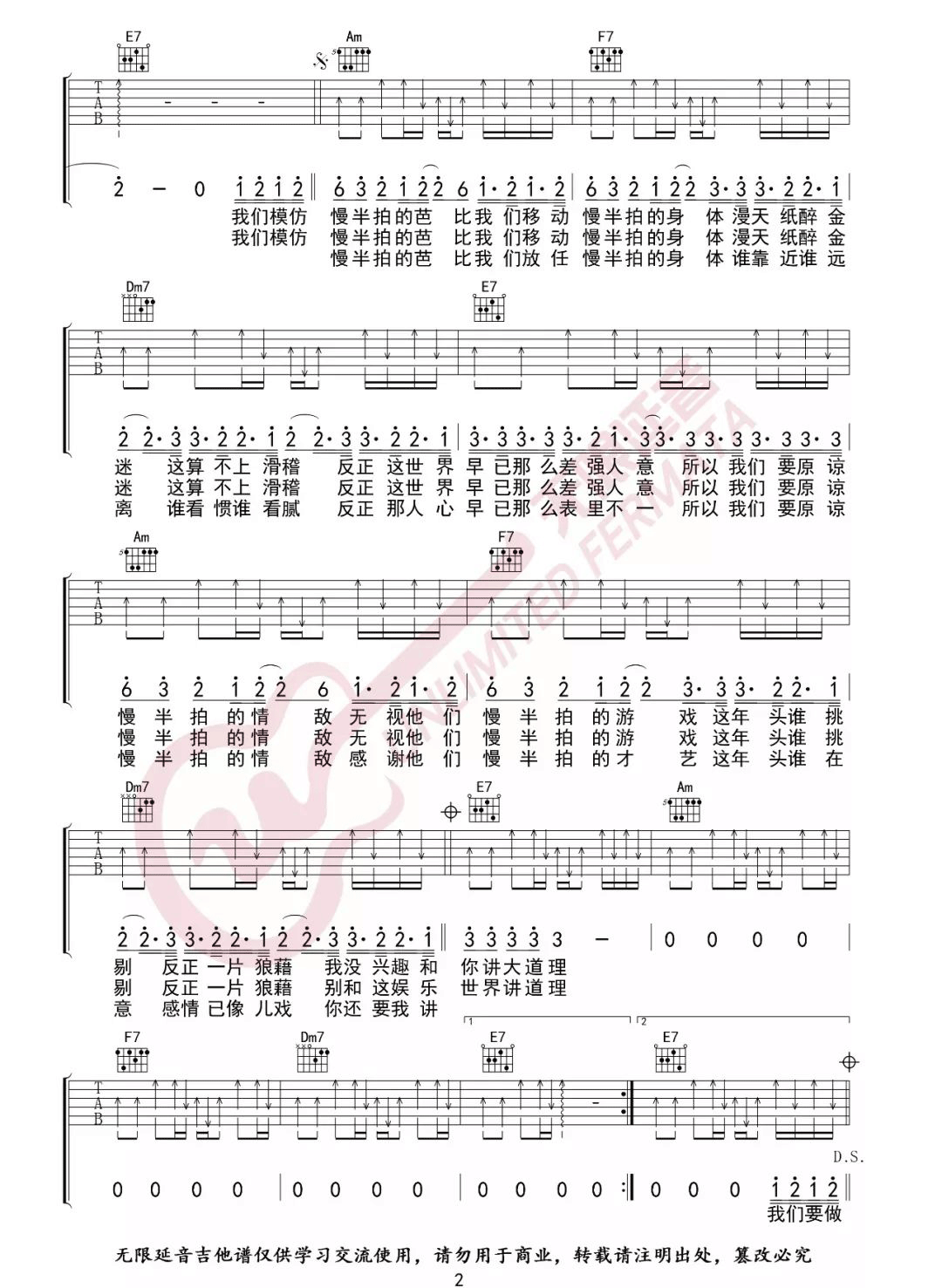 曲谱介绍: 慢半拍吉他谱_薛之谦_《慢半拍》C调扫弦版弹唱谱_高清六线谱分享,《慢半拍》是由许嵩作词作曲,薛之谦演唱的一首歌。通过这首歌薛之谦表达了对于当今时代人们随俗浮沉、审美无异又表里不一的思索与探析。 此版本的曲谱来源于无限延音扒谱制谱,这里歌曲采用C调指法进行编配,演唱时根据自己的嗓音情况夹变调夹。这首歌采用全扫弦的形式来编配,较之原版要简单一些,但缺少了原版那种律动感,适合新手练习。 慢半拍吉他谱_薛之谦_《慢半拍》C调扫弦版弹唱谱_高清六线谱1: