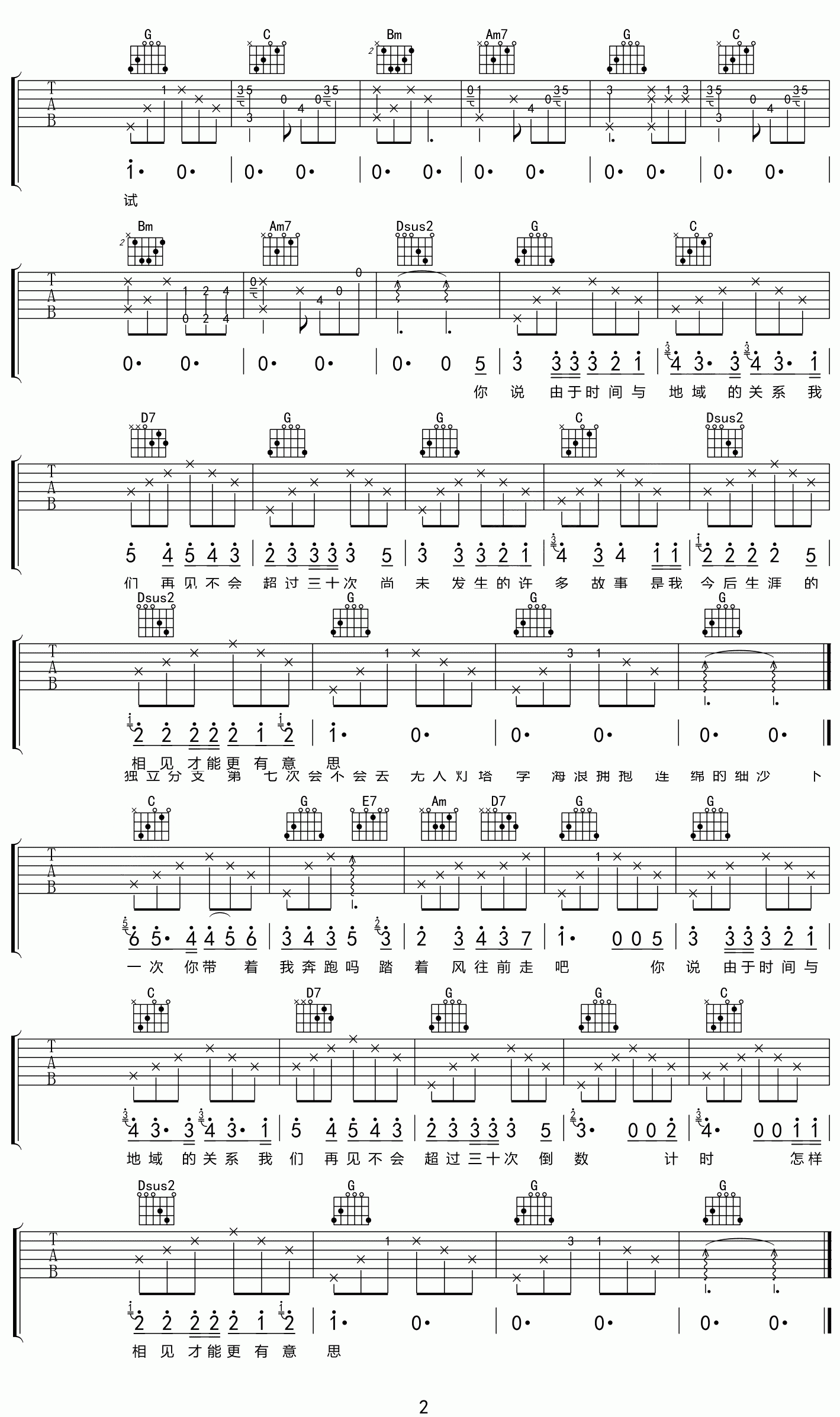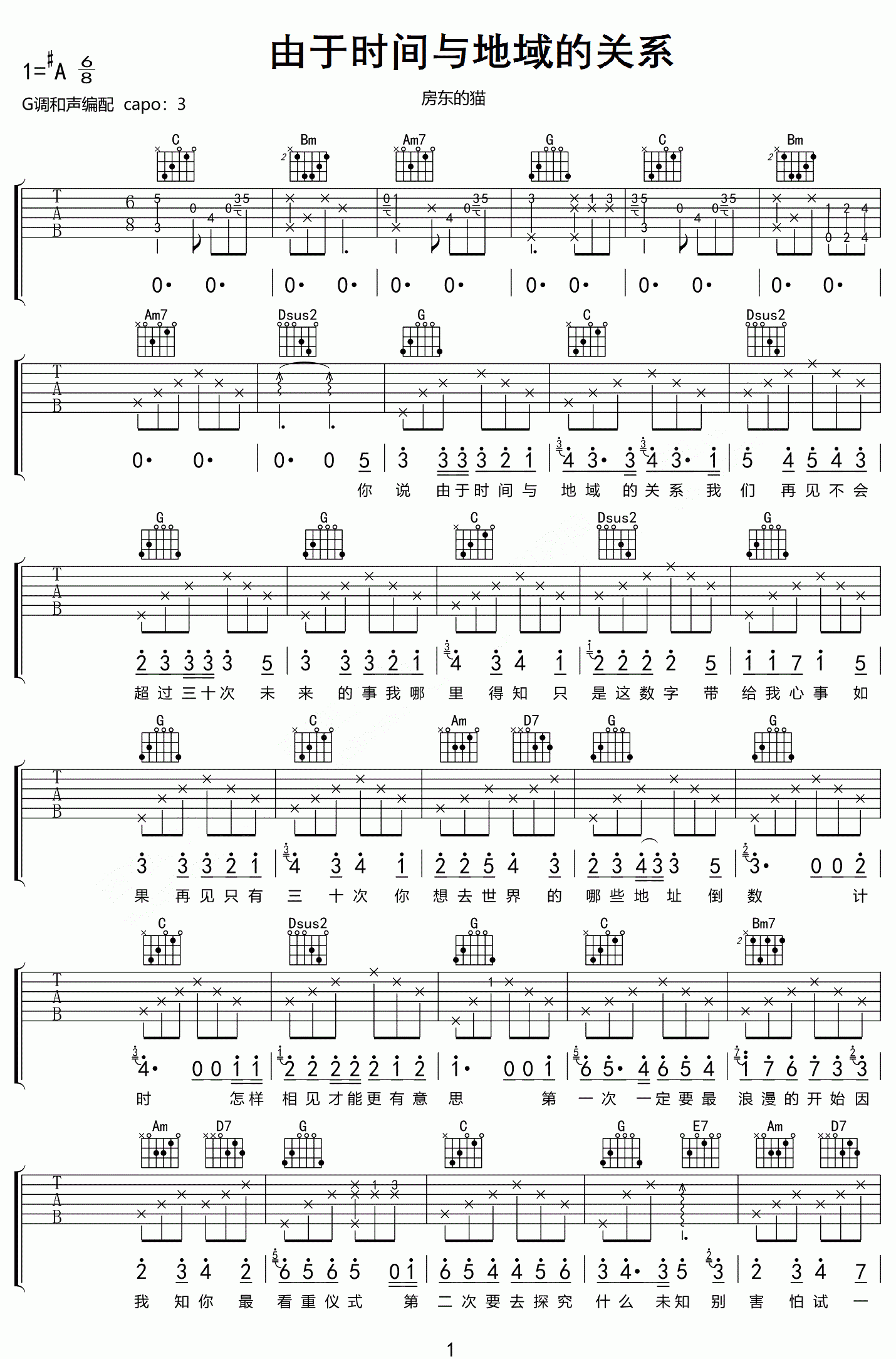 曲谱介绍: 《由于时间与地域的关系》吉他谱_房东的猫_G调原版弹唱六线谱分享,《由于时间与地域的关系》是由房东的猫演唱的一首歌。细细算来,你和想见面的人真正还能见面的次数还有多少?由于时间的错过,由于地域的相隔,由于身份的变换,每一次的见面,至少我是很珍惜那些时光。 此版本的曲谱来源于网络搜集,版权归原作者所有。歌曲原调为#A调,这里采用G调指法根据原版进行编配,演唱时夹变调夹3品。这首歌整体难度不大,主要在于前奏部分旋律音的练习。 《由于时间与地域的关系》吉他谱_房东的猫_G调原版弹唱六线谱1: