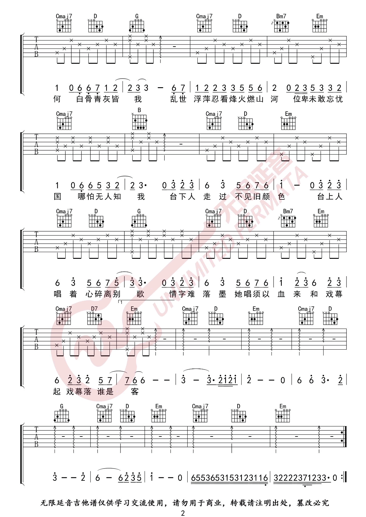 曲谱介绍: 赤伶吉他谱_HITA_《赤伶》G调原版弹唱谱_高清六线谱分享,《赤伶》是由HITA演唱的一首歌,“台下人走过不见旧颜色,台上人唱着心碎离别歌......”最近这几句歌词经常被刷到,悲伤的意境让人不免很是落寞,一首非常好听的古风歌曲。 此版本的曲谱来源于无限延音扒谱制谱,歌曲原调为B调,这里采用G调指法根据原版进行编配,演唱时夹变调夹4品回到原调。前奏带一些旋律音,比较好听,曲谱整体的节奏和指法都很简单,容易练下来。 赤伶吉他谱_HITA_《赤伶》G调原版弹唱谱_高清六线谱1: