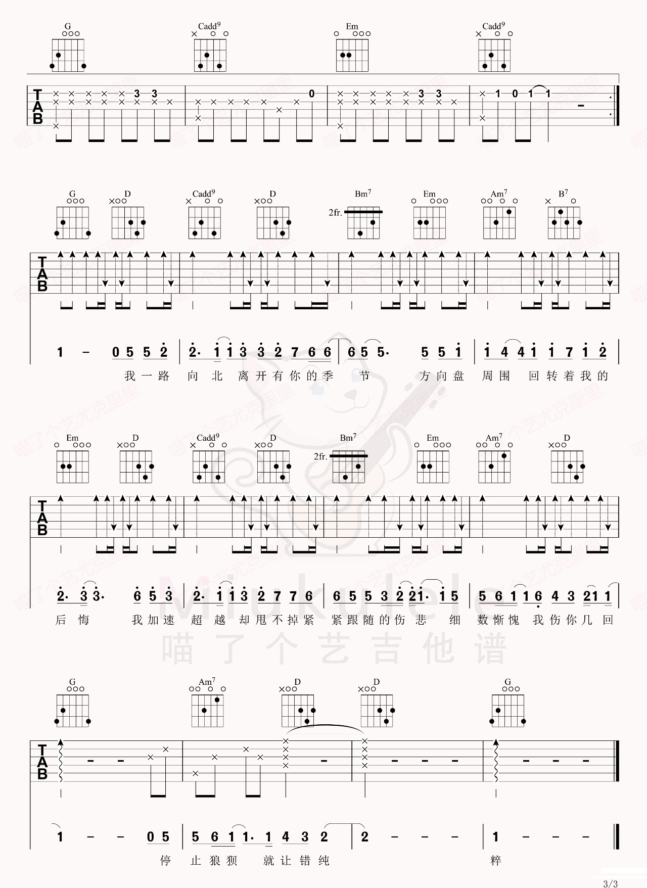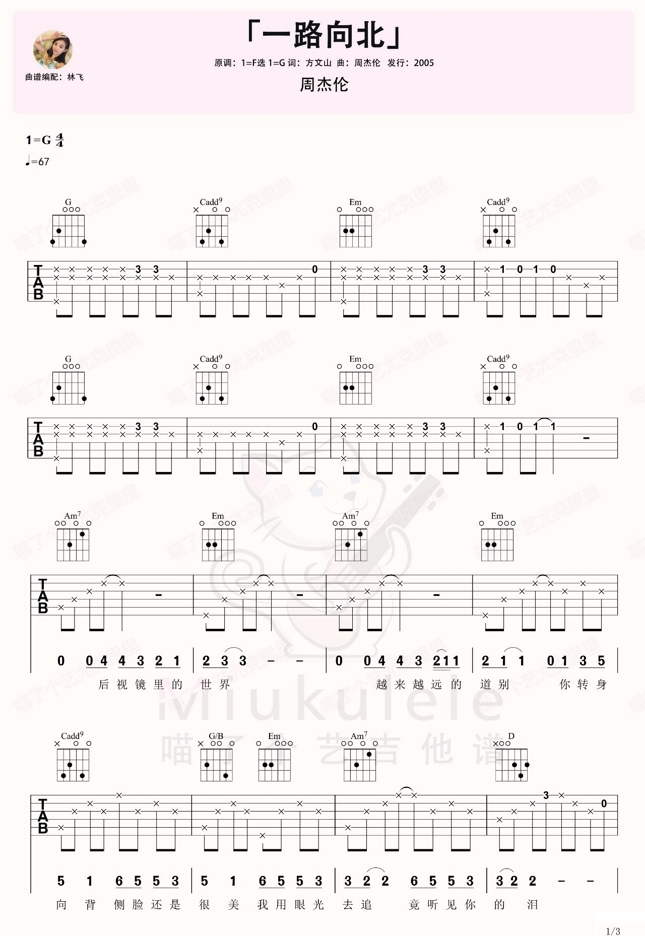 曲谱介绍: 《一路向北》吉他谱_周杰伦_G调原版弹唱六线谱_高清图片谱分享,《一路向北》是由周杰伦作曲并演唱的一首歌,这首歌也是周杰伦参演电影《头文字D》中的插曲,在赛场上得意,在情场上却失意,这与电影中的剧情很匹配。 此版本的曲谱来源于喵了个艺扒谱制谱,这里歌曲采用G调指法根据原版进行编配,演唱时根据自己的嗓音情况夹变调夹。这首歌弹奏难度并不大,节奏及和弦很简单,反而演唱难度要更大一些,高音部分是在不好唱上去。 《一路向北》吉他谱_周杰伦_G调原版弹唱六线谱_高清图片谱1:
