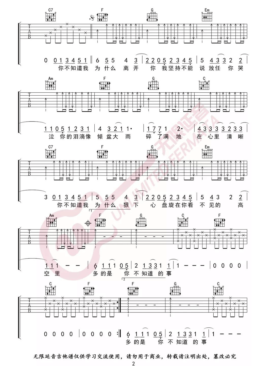 曲谱介绍: 《你不知道的事》吉他谱_王力宏_C调原版弹唱谱_高清六线谱分享,《你不知道的事》是由王力宏作词作曲并演唱的一首经典情歌,这首歌也是作为了王力宏和刘亦菲主演的电影《恋爱通告》的主题曲,非常好听并且耐听的一首歌。 此版本的曲谱来源于无限延音扒谱制谱,歌曲原调为#C调,这里采用C调指法根据原版进行编配,演唱时夹变调夹1品回到原调。前奏比较简单,就是和弦的分解,后面有个地方旋律音编配得比较好听,整体难度不大。 《你不知道的事》吉他谱_王力宏_C调原版弹唱谱_高清六线谱1: