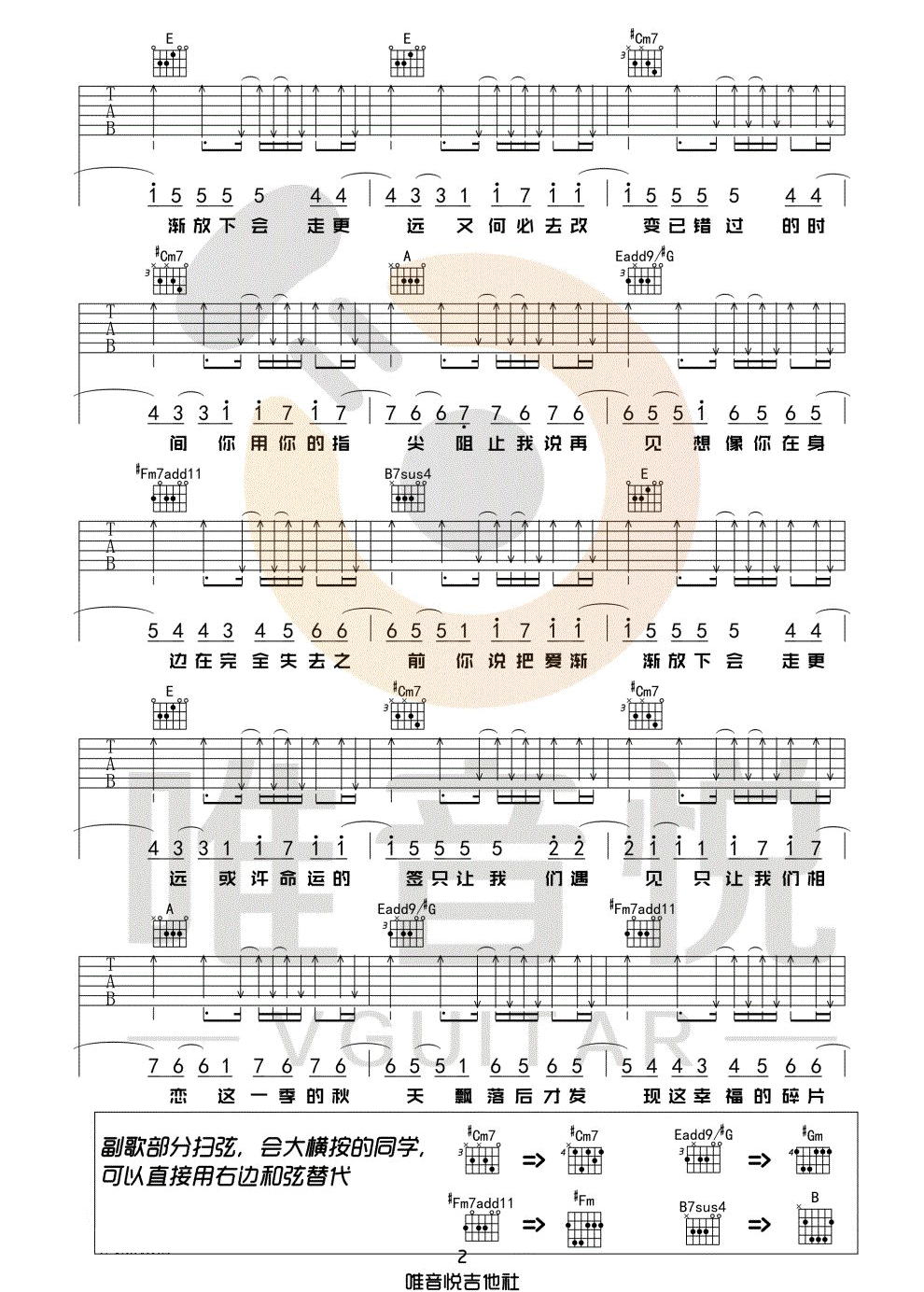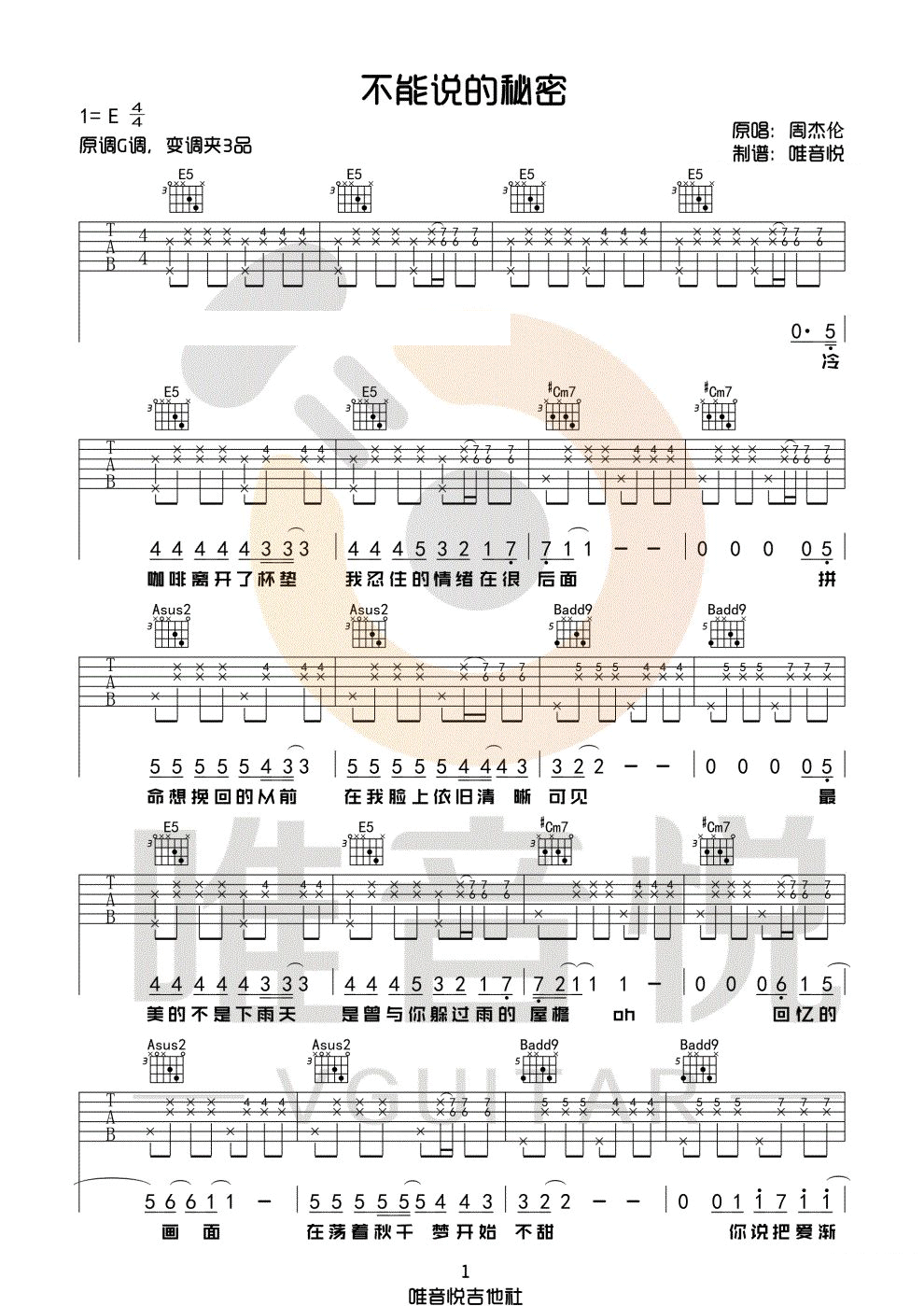 曲谱介绍: 《不能说的秘密》吉他谱_周杰伦_E调原版弹唱谱_高清六线谱分享,《不能说的秘密》是由方文山作词、周杰伦作曲并演唱的一首经典歌曲,这首歌同时也是作为了周杰伦自导自演的同名电影《不能说的秘密》主题曲。 此版本的曲谱来源于唯音悦扒谱制谱,歌曲原调为G调,这里采用E调指法根据原版进行编配,演唱时夹变调夹3品回到原调。这里的E调和弦都比较难按,还有一些高把位的指法,另外带附点的扫弦节奏型也要好好琢磨一下。 《不能说的秘密》吉他谱_周杰伦_E调原版弹唱谱_高清六线谱1: