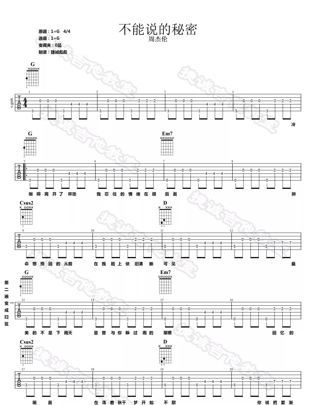 曲谱介绍: 《不能说的秘密》吉他谱_周杰伦_G调原版弹唱谱_高清六线谱分享,《不能说的秘密》是周杰伦作曲并演唱的一首歌,这首歌也是同名电影《不能说的秘密》里面的原声带。“最美的不是下雨天,是曾与你躲过雨的屋檐”,这是我听过最浪漫的歌词。 此版本的曲谱来源于捷诚吉他教室扒谱制谱,这里歌曲采用G调指法根据原版进行编配,演唱时根据自己的嗓音情况夹变调夹。这首歌前奏很好听,但指法相对于后面的分解和弦有些难度,需要多练习一下,整体难度也不大。 《不能说的秘密》吉他谱_周杰伦_G调原版弹唱谱_高清六线谱1:
