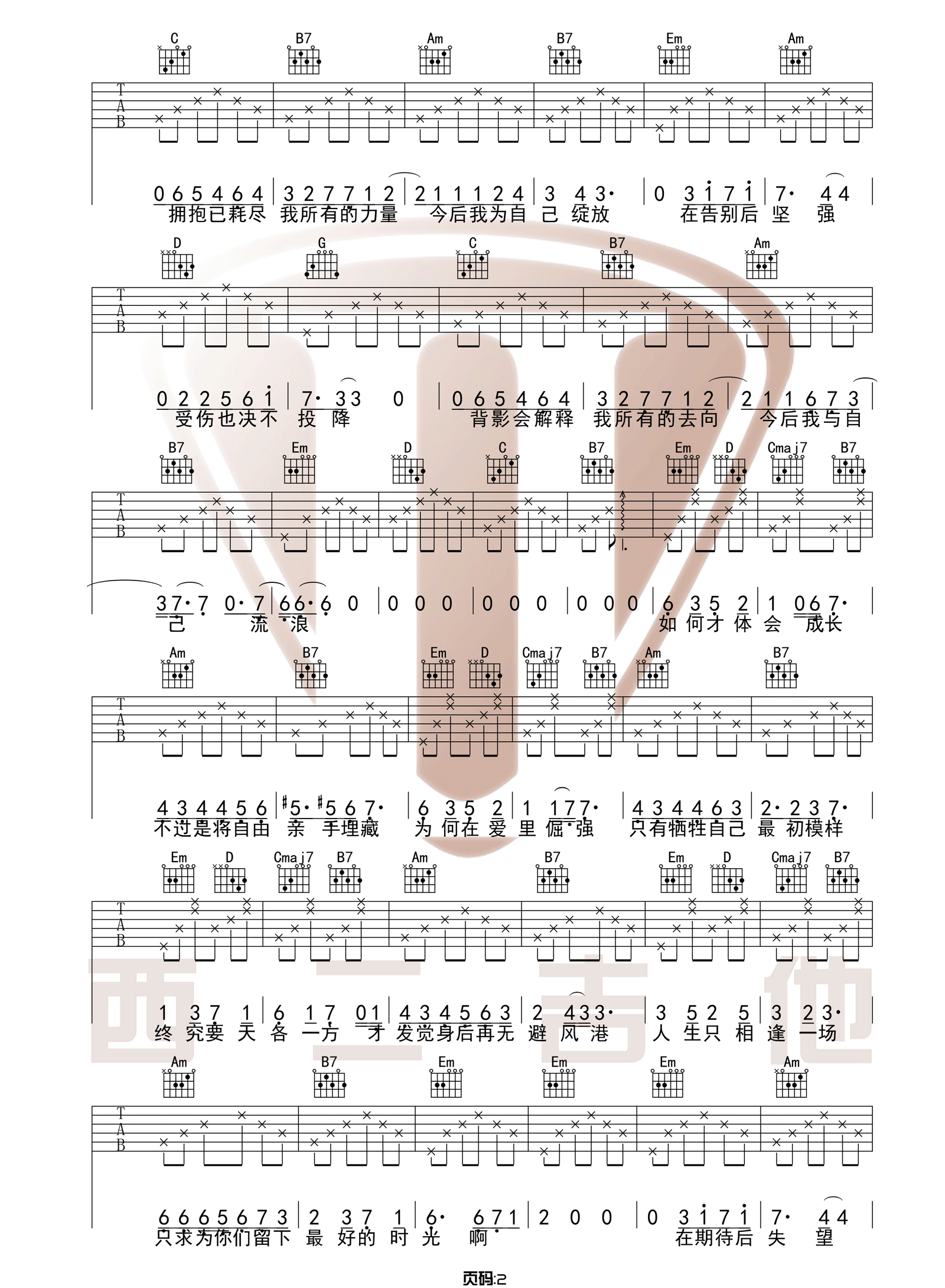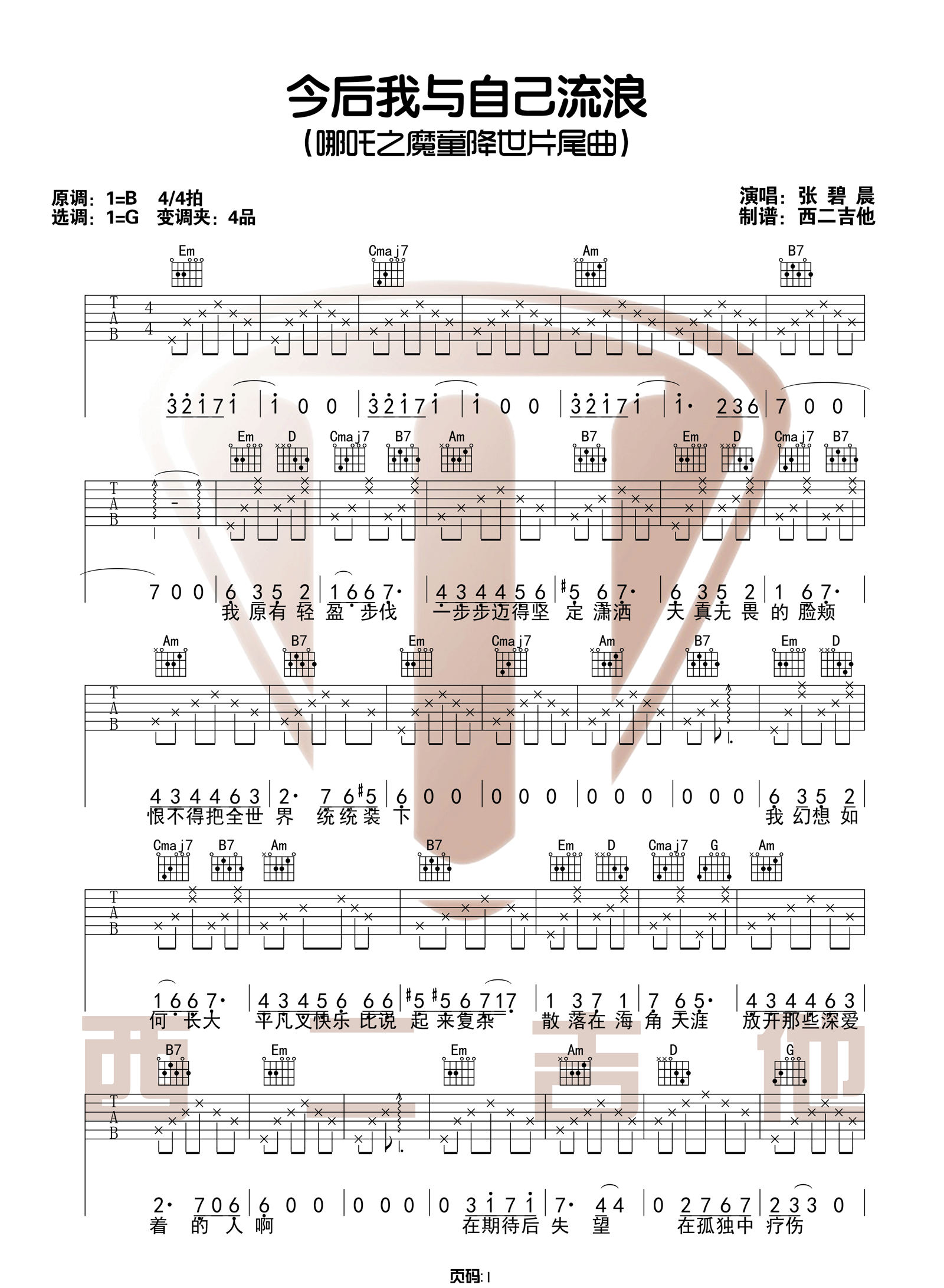 曲谱介绍: 《今后我与自己流浪》吉他谱_张碧晨_G调原版弹唱谱_六线谱分享,如果要说最近最火的电影是什么,那一定就是《哪吒之魔童降世》了,《今后我与自己流浪》这首歌也正是这部电影的片尾曲,由好声音冠军学员张碧晨演唱。 此版本的曲谱来源于西二吉他扒谱制谱,歌曲原调为B调,这里采用G调指法根据原版进行编配,演唱时夹变调夹4品回到原调。这首歌一共使用了5个和弦,除B7之外难度不大,而右手节奏型也是采用新手也能弹得来的T3231323,非常简单的一首歌。 《今后我与自己流浪》吉他谱_张碧晨_G调原版弹唱谱_六线谱1: