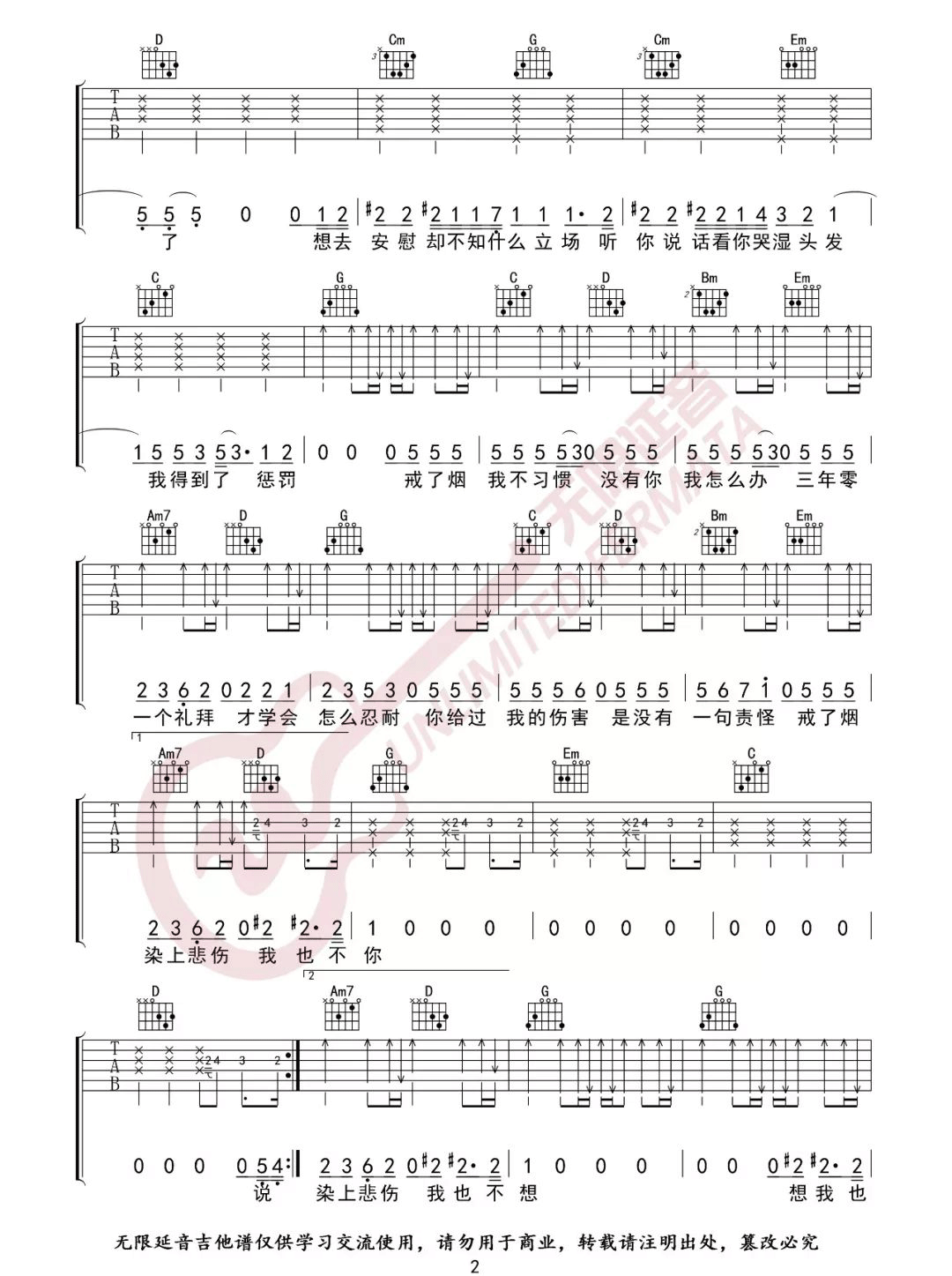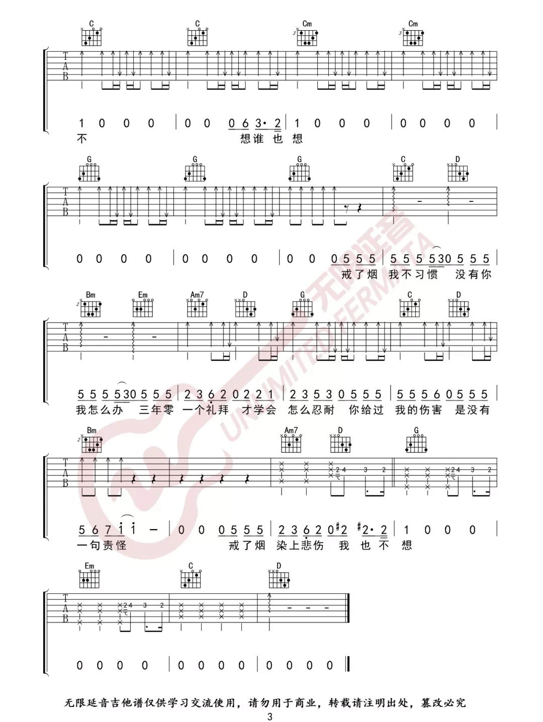 曲谱介绍: 戒烟吉他谱_李荣浩_《戒烟》G调原版弹唱六线谱_高清图片谱分享,《戒烟》是由作词作曲并演唱的一首歌,这里用对比的手法表达了主人公内心的愧疚与失落,戒烟其实是简单的,但是岁月漫长,就是戒不了“你”。 此版本的曲谱来源于无限延音扒谱制谱,这里歌曲采用了G调指法根据原版进行编配,演唱时根据自己的嗓音情况夹变调夹。这首歌练习的难点在于前奏部分的旋律音和节奏,后面的部分都非常简单。 戒烟吉他谱_李荣浩_《戒烟》G调原版弹唱六线谱_高清图片谱1: