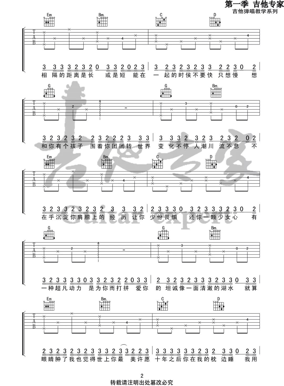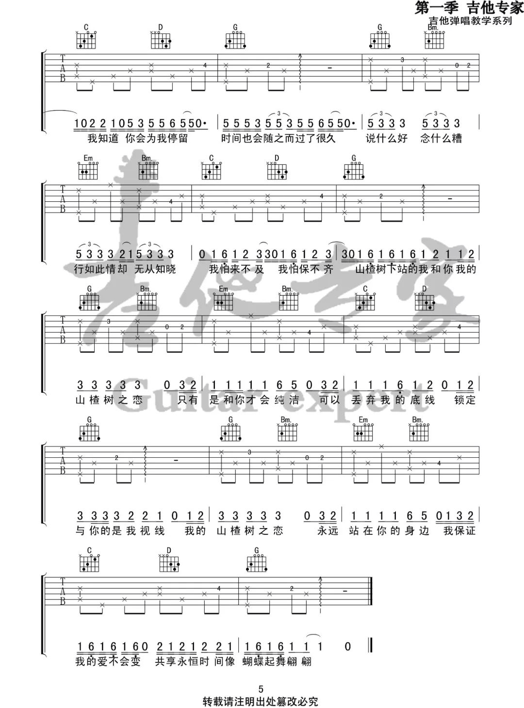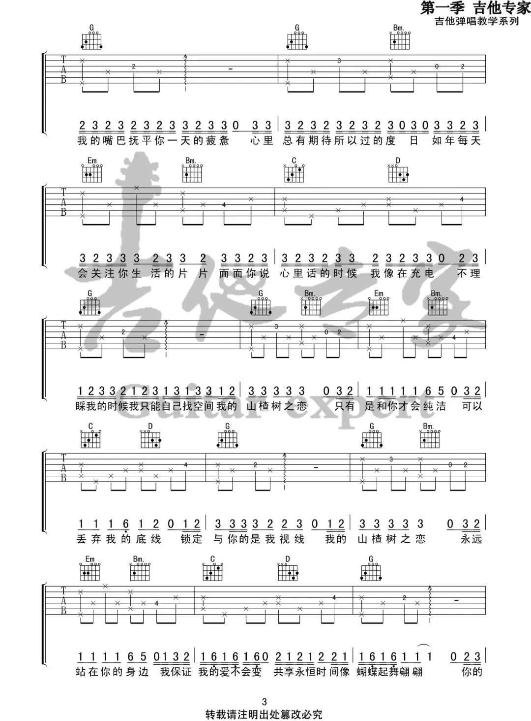 曲谱介绍: 《山楂树之恋》吉他谱_大能人/程佳佳_G原版弹唱谱_高清六线谱分享,《山楂树之恋》是由大能人演唱的一首歌,此次分享的是由程佳佳翻唱这首歌版本的曲谱。 此版本的曲谱来源于音艺吉他专家扒谱制谱,歌曲原调为降B调,这里采用G调指法根据原版进行编配,演唱时夹变调夹3品回到原调。节奏和和弦很简单,比较容易学会。 《山楂树之恋》吉他谱_大能人/程佳佳_G原版弹唱谱_高清六线谱1-2: