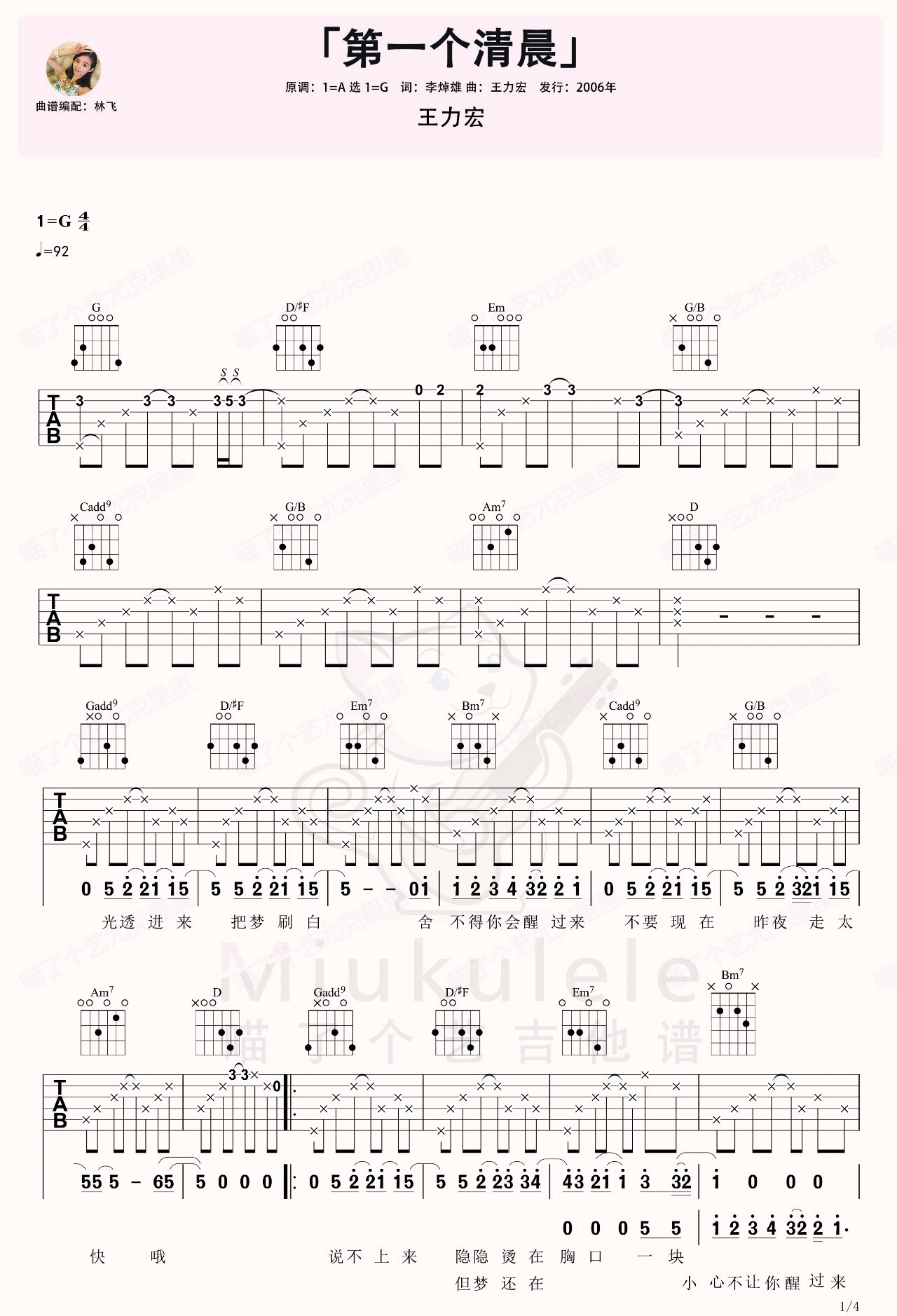 曲谱介绍: 《第一个清晨》吉他谱_王力宏_G调原版弹唱谱_高清六线谱分享,《第一个清晨》是由王力宏作曲并演唱的一首老歌。这首歌曲的灵感来自王力宏对爱情的感觉,歌词写的也是王力宏对爱情的体验。在爱情刚开始时,就是还没有彼此伤害、没有对不起对方时,这种感觉是很美好的。 此版本的曲谱来源于喵了个艺扒谱制谱,这里歌曲采用G调指法根据原版进行编配,演唱时根据自己的嗓音情况夹变调夹。这首歌编配的比较简单,通篇都采用的是分解和弦,只需要将和弦级数,熟练转换,再加一些击勾弦小技巧即可。 《第一个清晨》吉他谱_王力宏_G调原版弹唱谱_高清六线谱1-2: