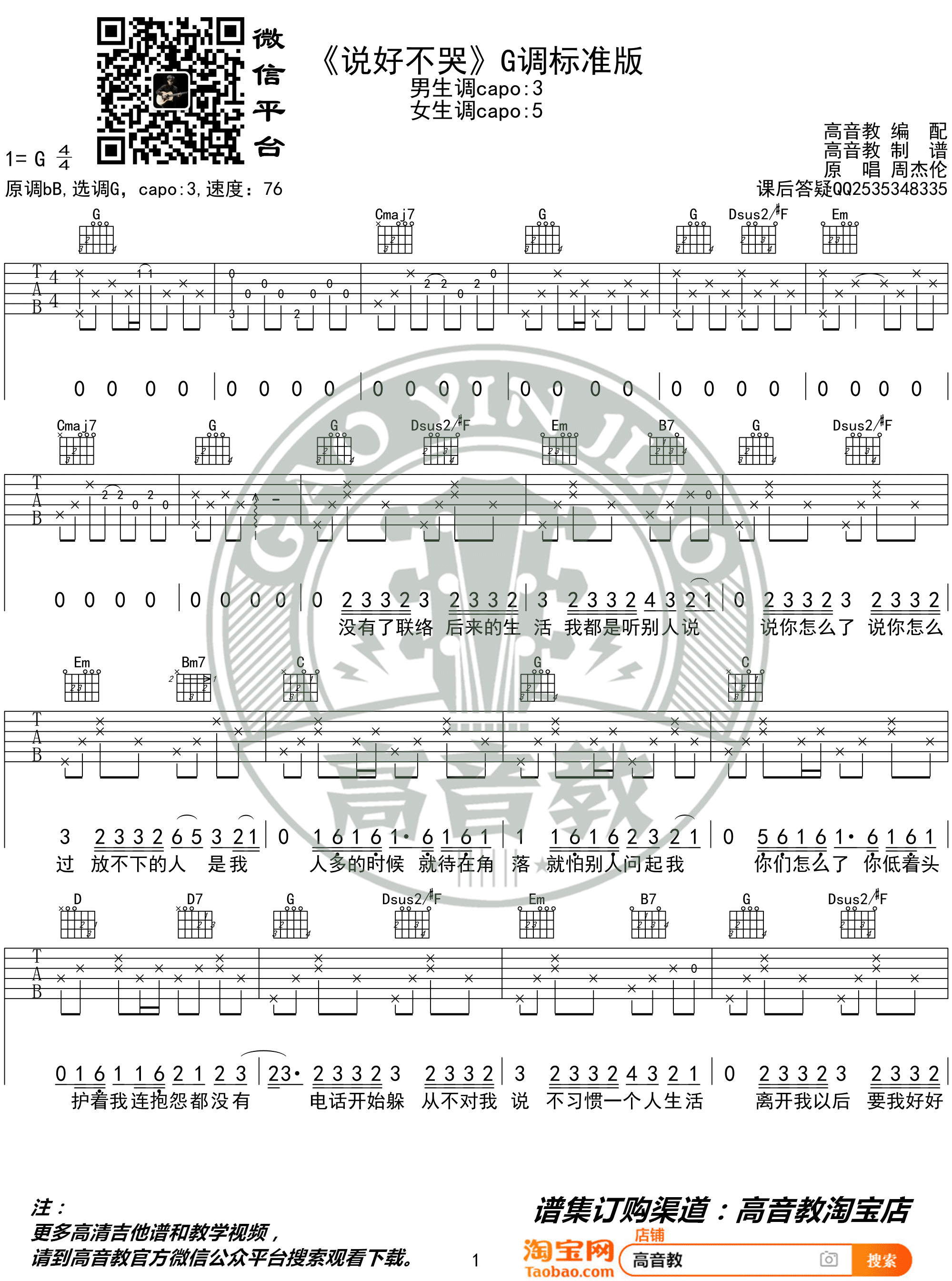 曲谱介绍: 说好不哭吉他谱_周杰伦_《说好不哭》G调六线谱_吉他弹唱教学分享,周杰伦最新单曲《说好不哭》震撼来袭,这首歌由方文山作词,阿信和杰伦演唱,周杰伦和五月天可以说是很多八零九零后青春的回忆了,这次他们的合作令人实在惊喜。 此版本的曲谱及教学来源于高音教出品,歌曲原调为降B调,这里采用了G调指法根据原版进行编配,演唱时夹变调夹3品即可回到原调。这首歌编配也不难,有不懂的地方可以参考下方的吉他弹唱教学视频。 说好不哭吉他谱_周杰伦_《说好不哭》G调六线谱_吉他弹唱教学视频:   说好不哭吉他谱_周杰伦_《说好不哭》G调吉他弹唱六线谱_高清图片谱: