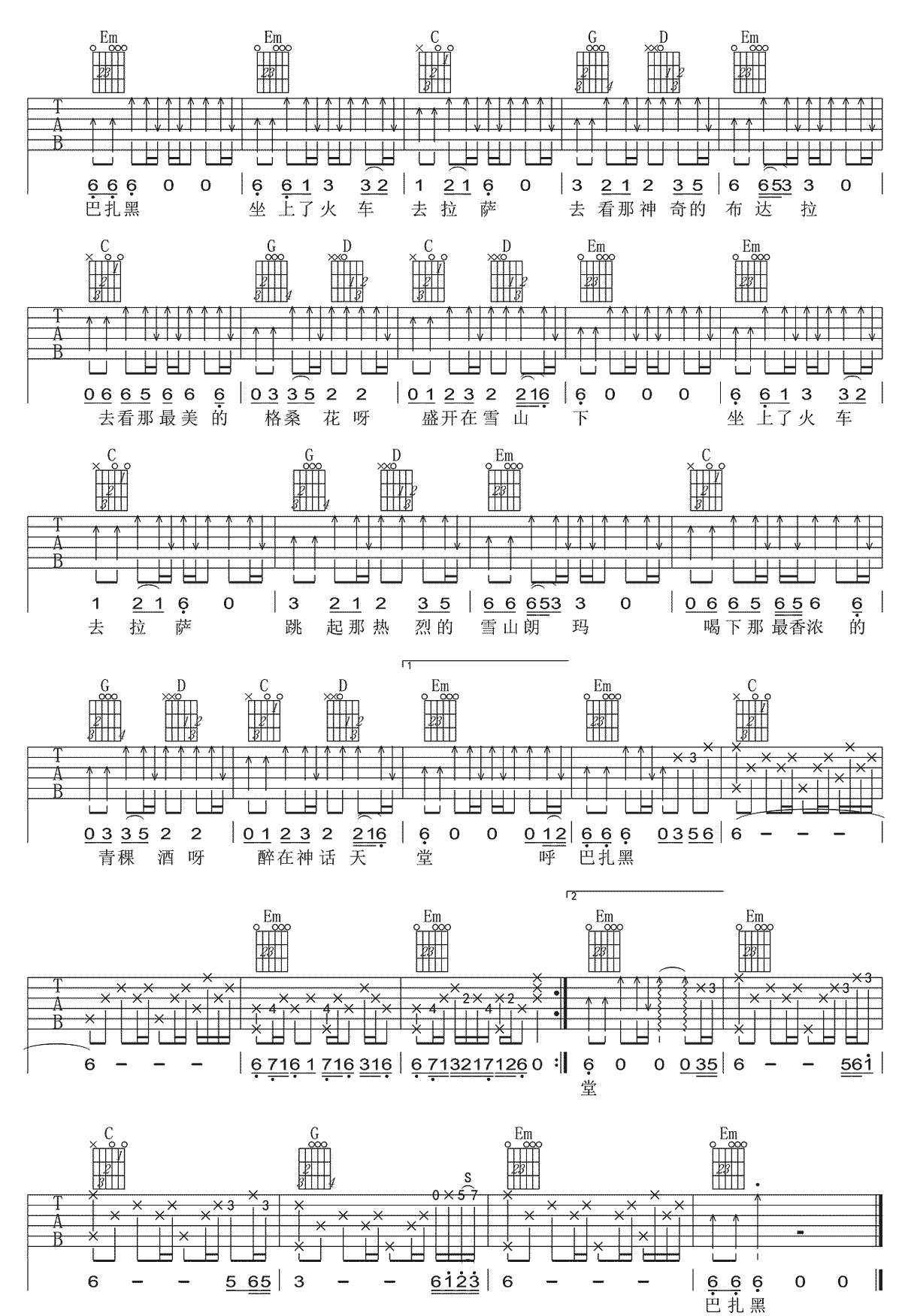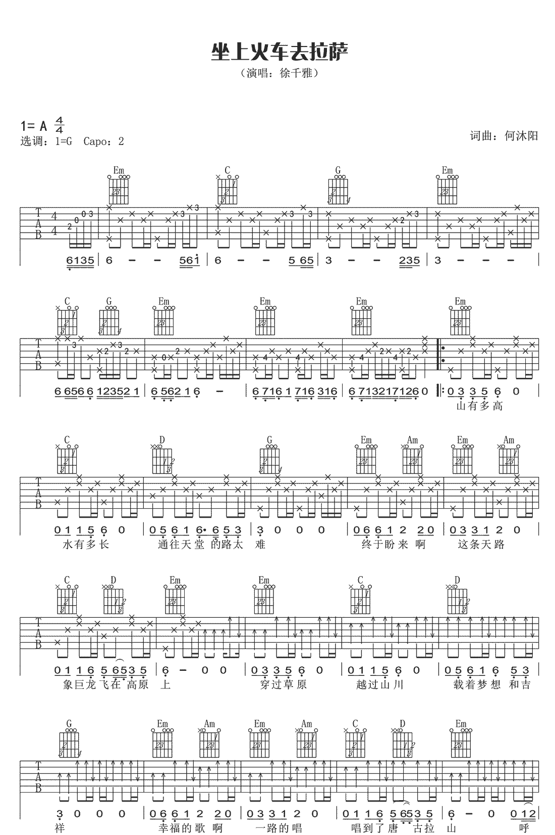 曲谱介绍: 《坐上火车去拉萨》吉他谱_徐千雅_G调原版弹唱谱_高清六线谱分享,《坐上火车去拉萨》是由徐千雅演唱的一首歌,这首歌是为了庆祝青藏铁路开通而创作的一首地域性现代民歌,将民歌与现代音乐元素融合在一起。 此版本的曲谱来源于网络搜集,版权归原作者所有。歌曲原调为A调,这里采用G调指法根据原版进行编配,演唱时夹变调夹2品回到原调。这首歌练习的难点主要在于前奏和间奏上,其他部分和弦及节奏都比较简单。 《坐上火车去拉萨》吉他谱_徐千雅_G调原版弹唱谱_高清六线谱1: