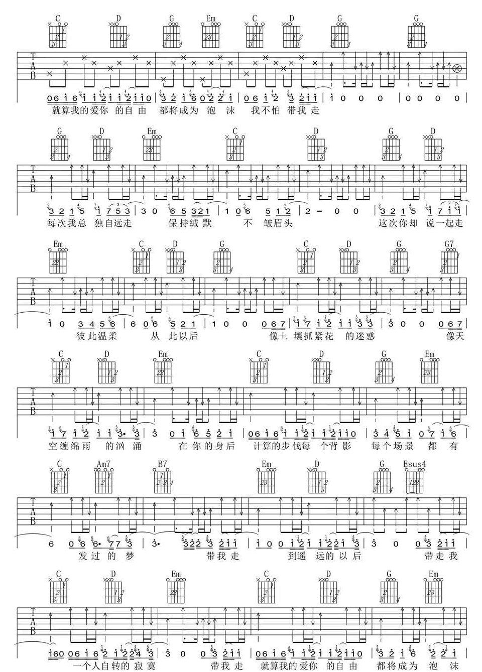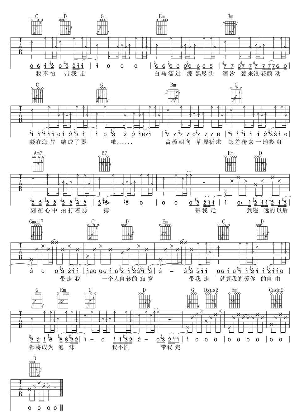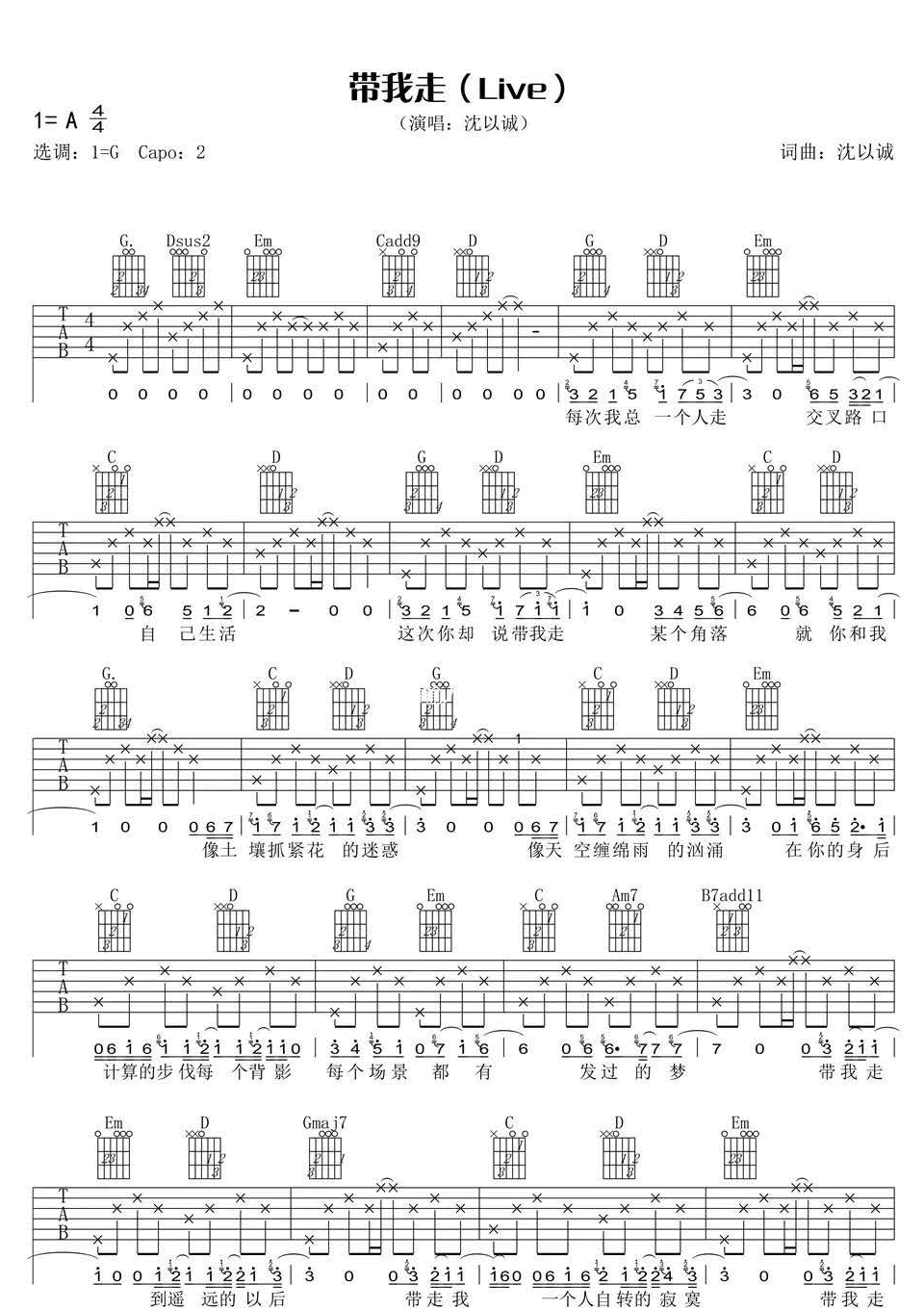曲谱介绍: 带我走吉他谱_沈以诚_《带我走》G调原版弹唱谱_高清六线谱分享,《带我走》是由沈以诚翻唱杨丞琳的一首歌。每次我总一个人走,交叉路口,自己生活,这次你却说带我走,某个角落,就你和我,像土壤抓紧花的迷惑,像天空缠绵雨的汹涌。 此版本的曲谱来源于新辉吉他扒谱制谱,歌曲原调为A调,这里采用G调指法根据沈以诚演唱原版进行编配,演唱时夹变调夹2品回到原调。歌曲编配整体难度不大,和弦和节奏型都比较简单,容易练习。 带我走吉他谱_沈以诚_《带我走》G调原版弹唱谱_高清六线谱1: