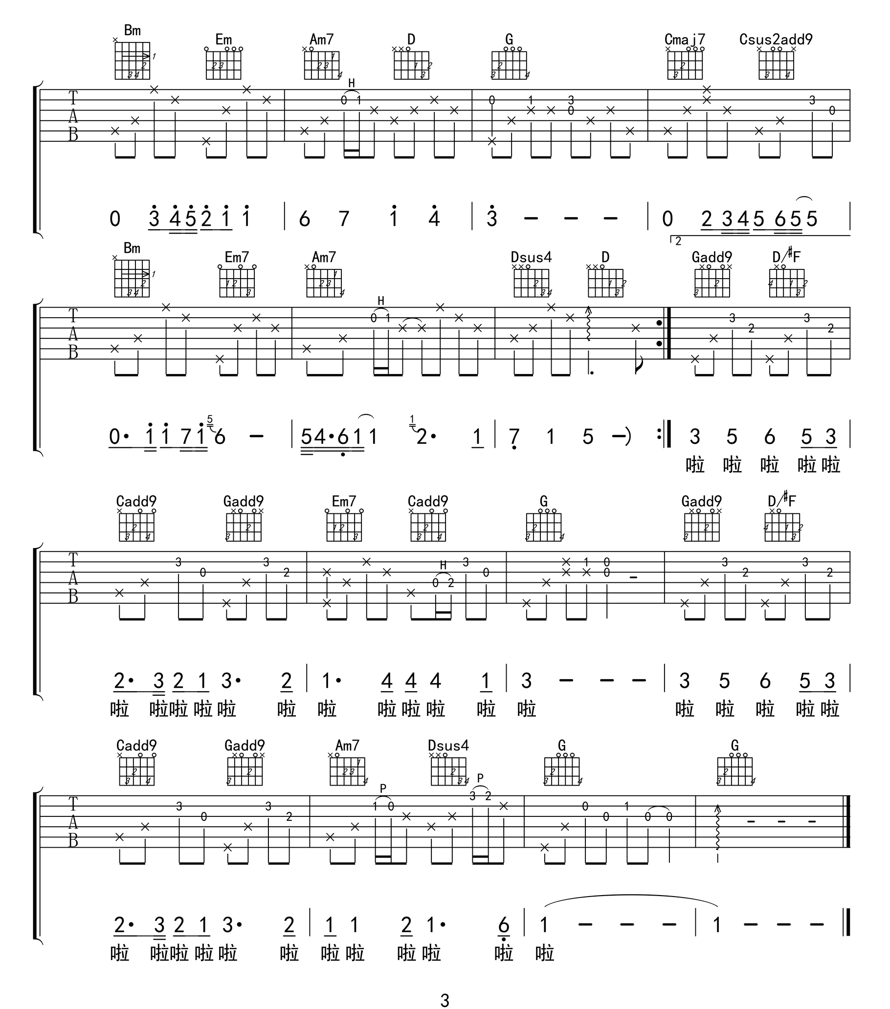 曲谱介绍: 《不再流浪》吉他谱_周深_G调原版弹唱六线谱_高清图片谱分享,《不再流浪》是由实力唱将周深演唱的一首歌,这首歌也是电影《罗小黑战记》的推广曲目,这首歌是一首非常治愈系的歌曲。 此版本的曲谱来源于白健平扒谱制谱,歌曲原调为降A调,这里采用G调指法根据原版进行编配,演唱时夹变调夹1品回到原调。这首歌编配难度适中,前奏的旋律部分及歌曲中间带有的一些装饰音,使得伴奏比较丰富不单调。 《不再流浪》吉他谱_周深_G调原版弹唱六线谱_高清图片谱1: