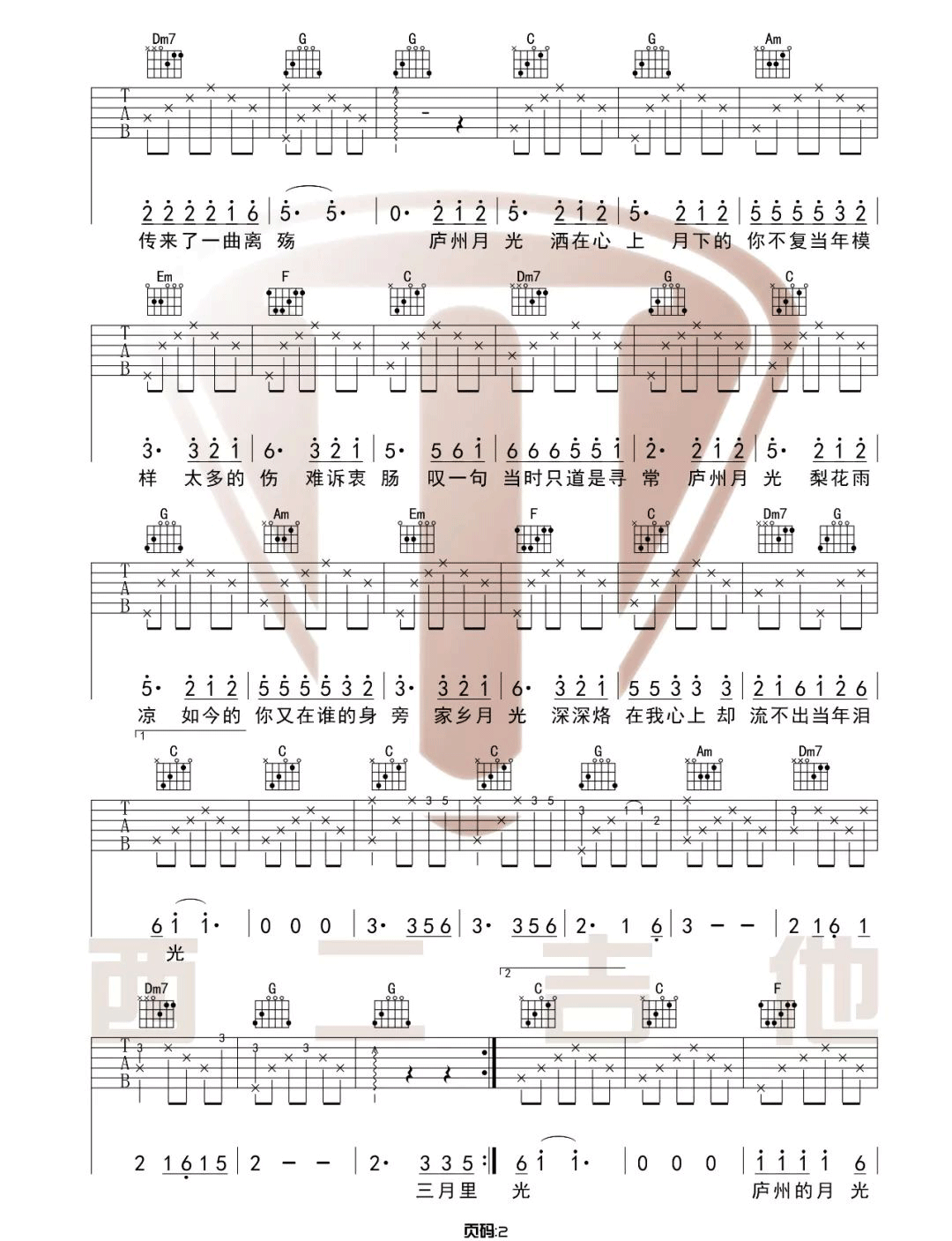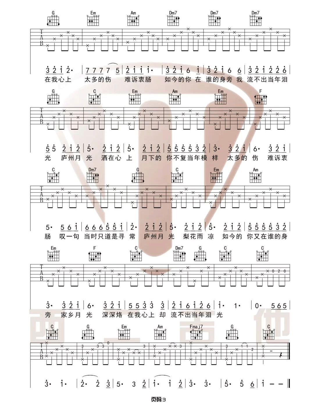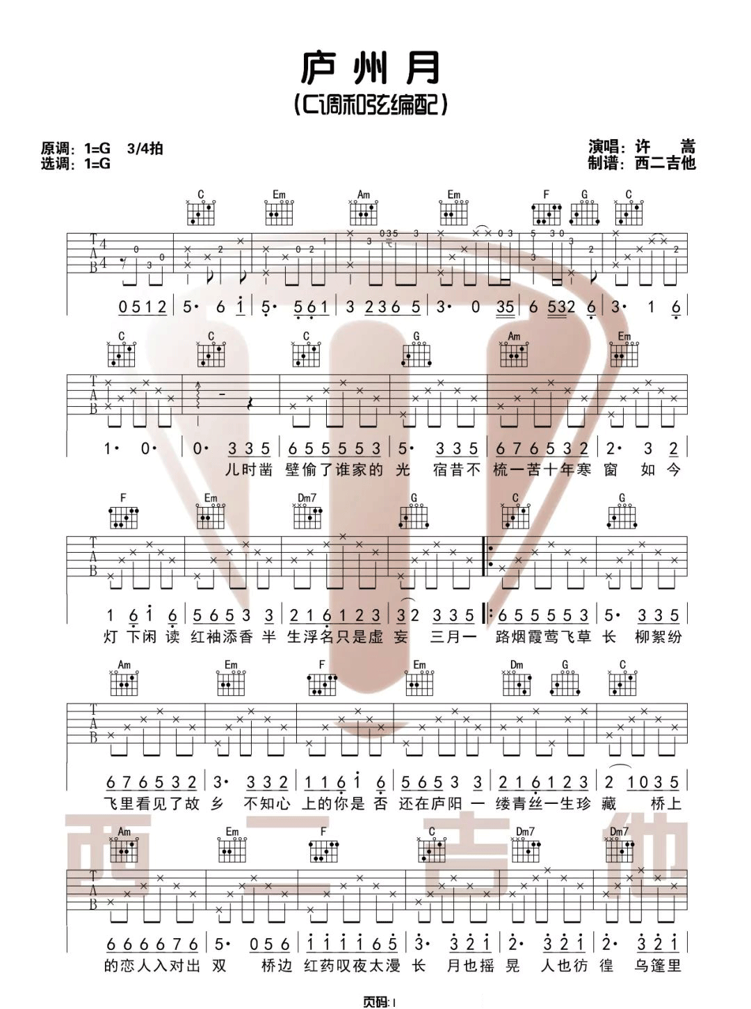 曲谱介绍: 庐州月吉他谱_许嵩_《庐州月》G调原版六线谱_吉他弹唱教学分享,《庐州月》是由许嵩作词作曲并演唱的一首中国风的歌曲。这首歌的内容意思为庐州的月亮依然是当时月亮,但是当年月光下的两个人已经各奔东西了,这首歌蕴含了对友人的无尽思念。 此版本的曲谱及教学来源于西二吉他出品,这里采用了歌曲的原调G调指法根据原版进行编配,演唱时根据自己的嗓音情况夹变调夹。这首歌的难点主要在于前奏部分的指法稍难,其他地方都是比较简单的。 庐州月吉他谱_许嵩_《庐州月》G调原版六线谱_吉他弹唱教学视频:   庐州月吉他谱_许嵩_《庐州月》G调原版吉他弹唱六线谱_高清图片谱1: