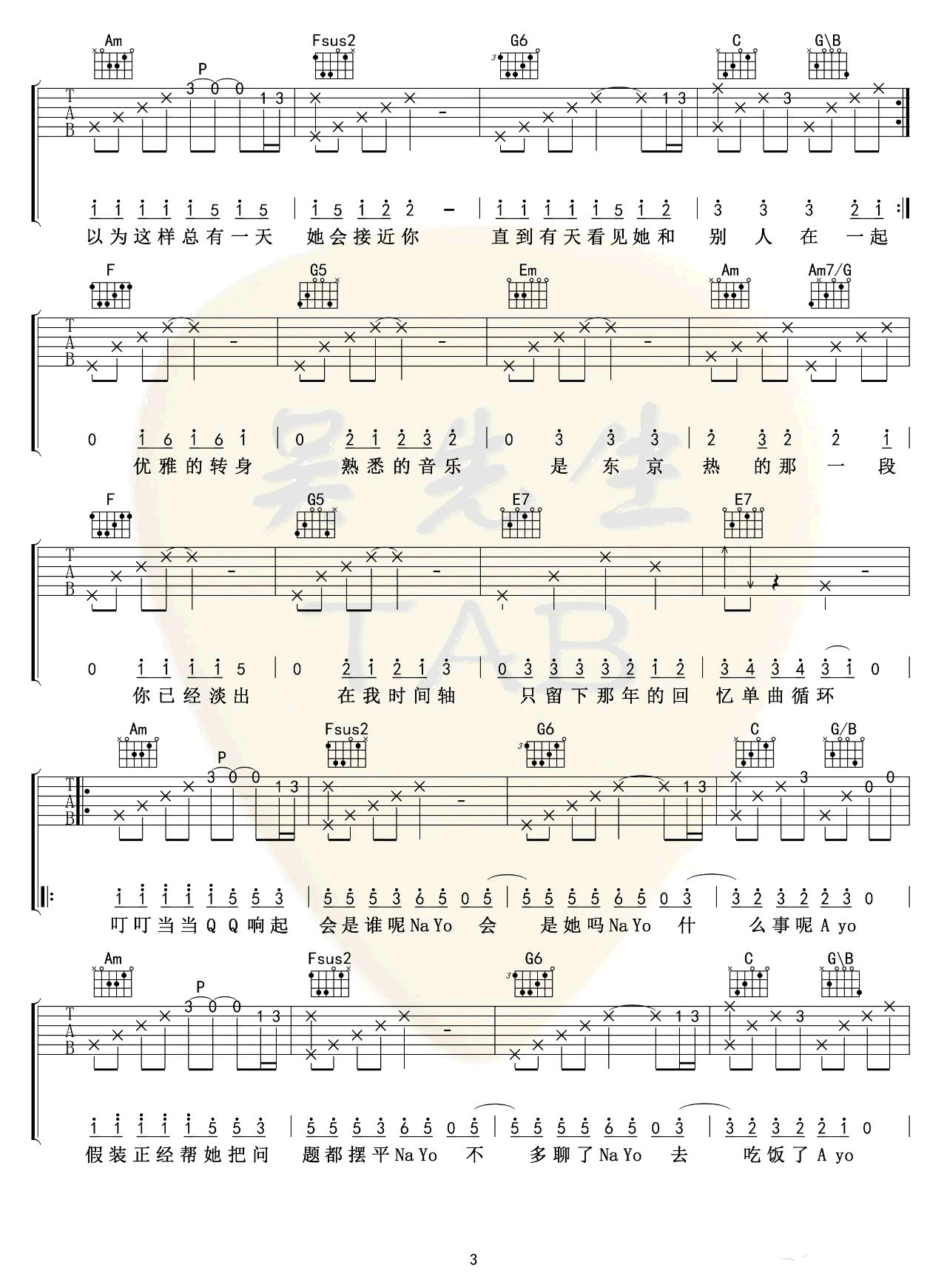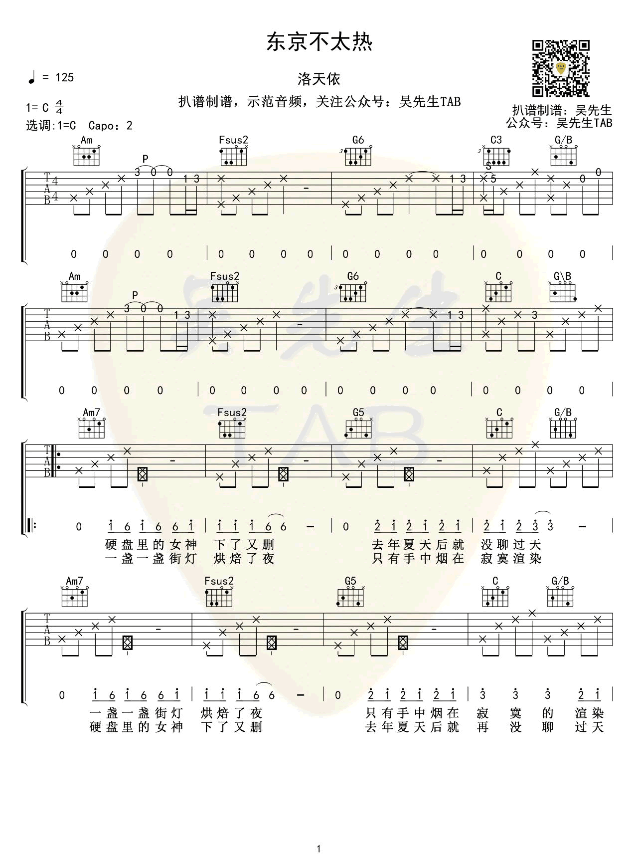 曲谱介绍: 《东京不太热》吉他谱,洛天依演唱,C调,CAPO夹二品。东京不太热六线谱,完整版共四张弹唱图片谱。吴先生TAB扒谱制谱,91吉他谱网站更新上传。 在B站突破百万播放量的《东京不太热》,描写了一个男孩纸对喜欢的女孩想追求又不敢追求的纠结心态。故作高冷,顺其自然却眼睁睁地看着她和别人在一起。