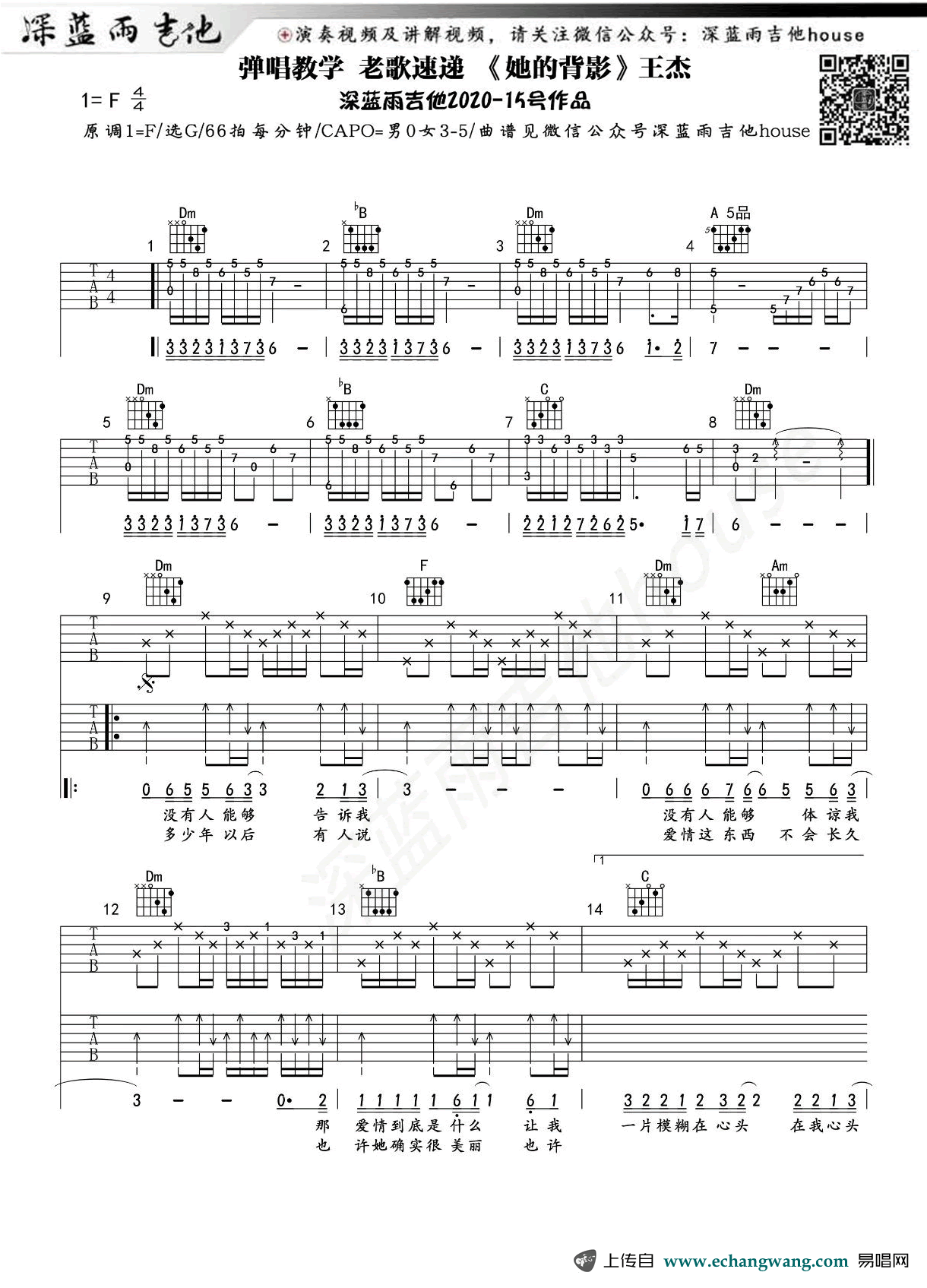 曲谱介绍: 《她的背影》吉他谱,王杰的一首经典老歌,她的背影六线谱,原调F选调C,CAPO男生不夹,女生3-5品。三张弹唱图片谱,91吉他谱吉他编配出品,91吉他谱网站更新上传。一首唱出忧伤和孤独的悲情歌曲,令人伤感与心痛。歌曲是电视剧《深情无怨尤》主题曲,粤语版为《谁明浪子心》。随谱附上吉他弹唱演示视频,琴友们可以参照老师的示范演示练习起来。