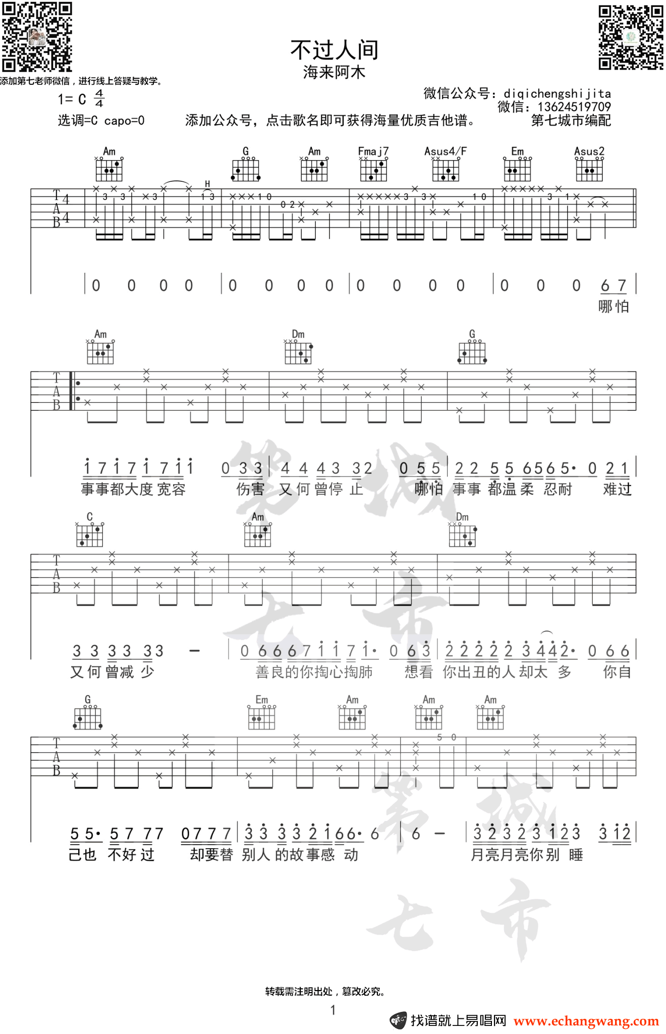 曲谱介绍: 海来阿木《不过人间》吉他弹唱谱,共有3张高清图谱。