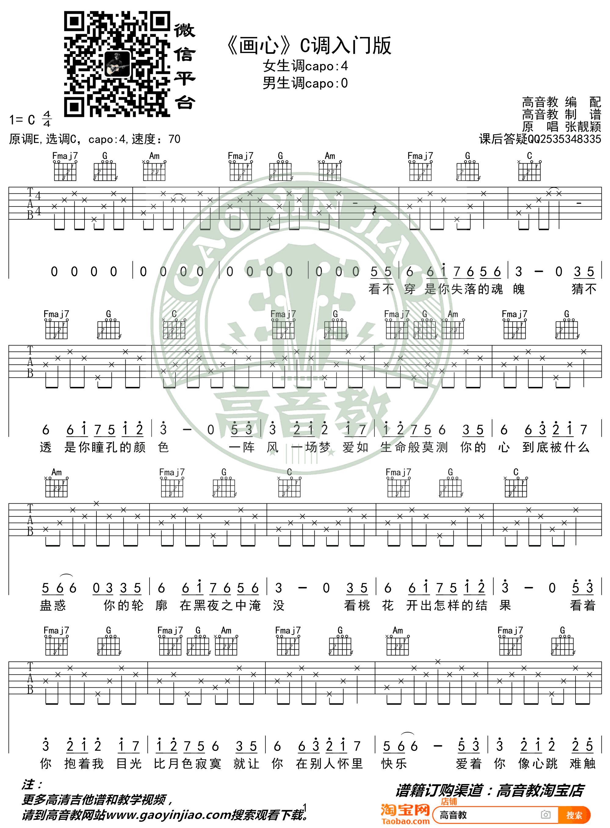 曲谱介绍: 《画心》吉他谱,张靓颖献唱电影《画皮》主题曲。画心六线谱,C调入门版,女生选用变调夹夹四品。高音教编配出品,91吉他谱上传。 一首清唱浅吟的伤感情歌,一段梦魇般的人鬼凄美之恋。这首歌比较简单,总共就三个和弦,同步附上画心吉他弹唱教学视频,琴友们可以跟随猴哥老师的讲解示范练习起来。