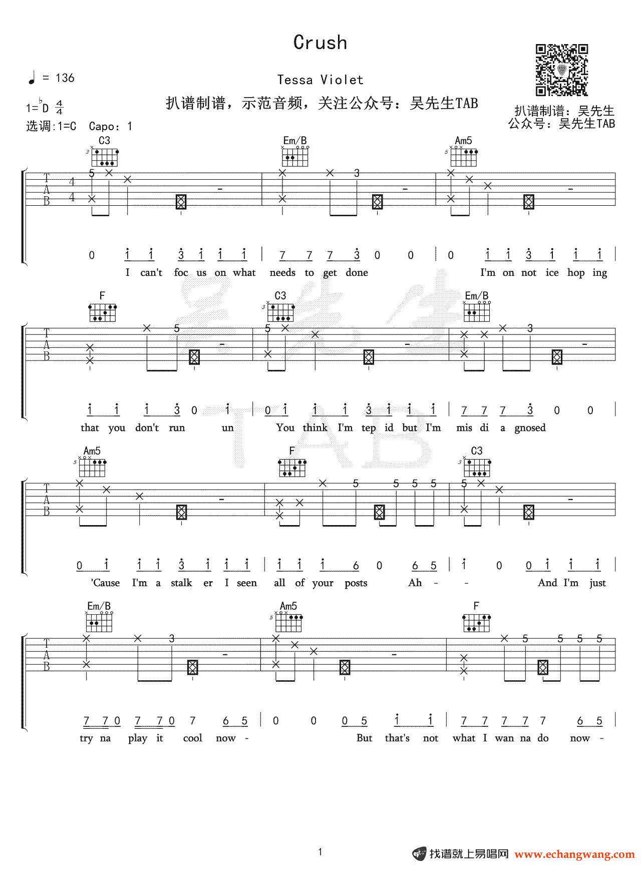 曲谱介绍: 《Crush》吉他谱,美国唱作女才女Tessa Violet演唱的一首英文歌曲,CRUSH吉他弹唱谱,原调bD,选用C调指法,变调夹夹一品。完整版共六张图片六线谱。感谢吴先生Tab扒谱分享,91吉他谱更新上传。