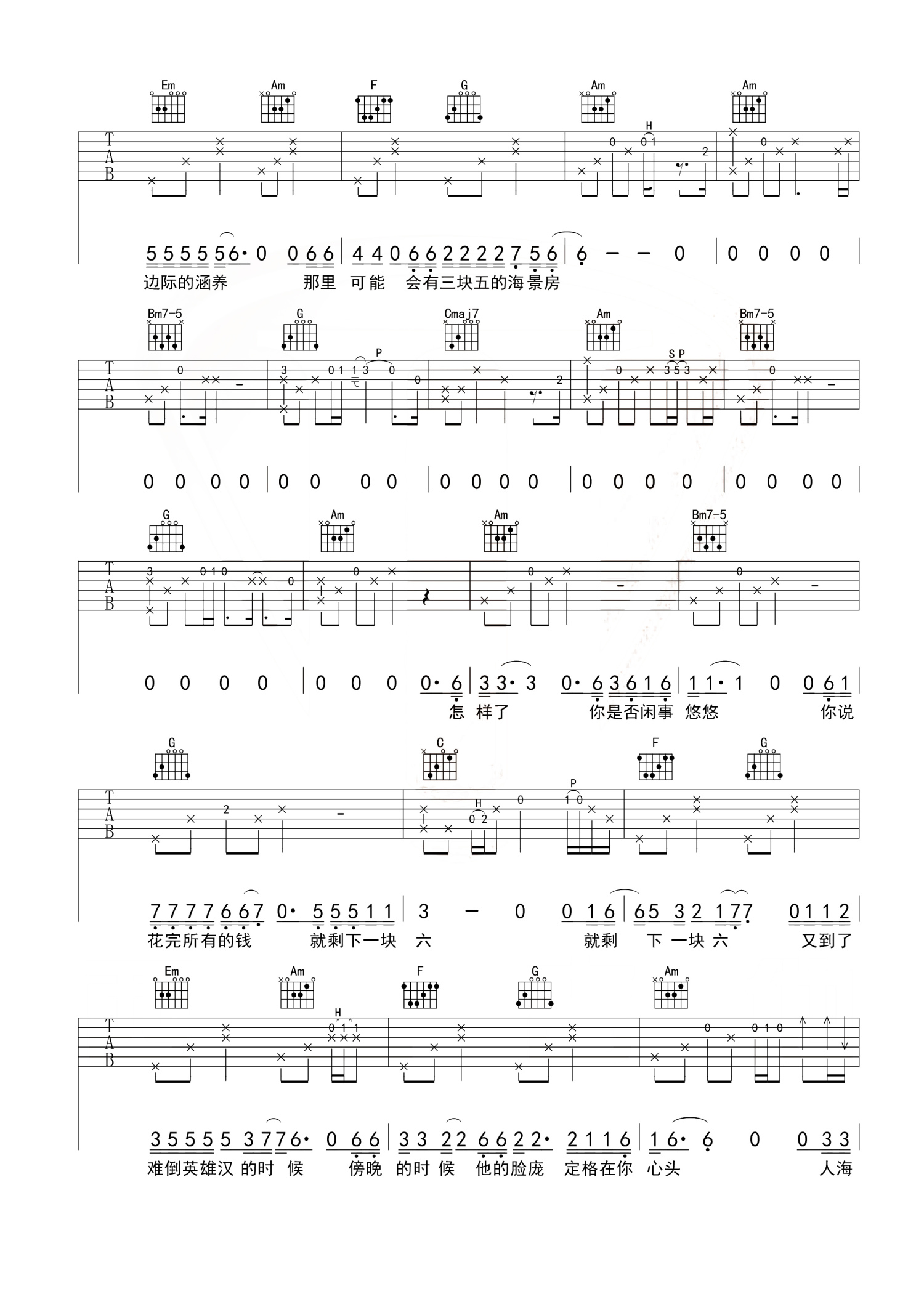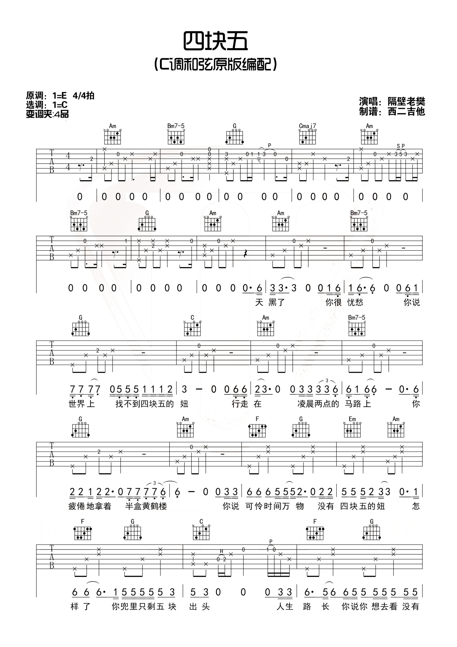 曲谱介绍: 隔壁老樊《四块五》吉他谱_弹唱六线谱 西二吉他版本