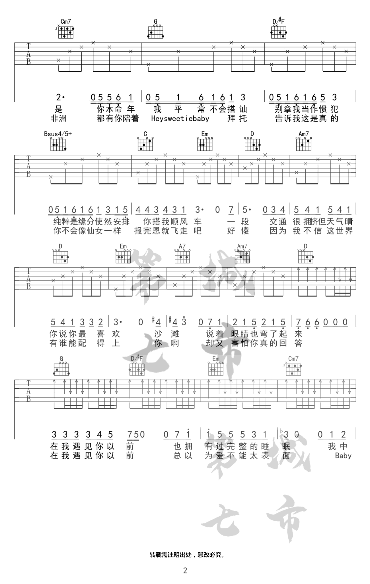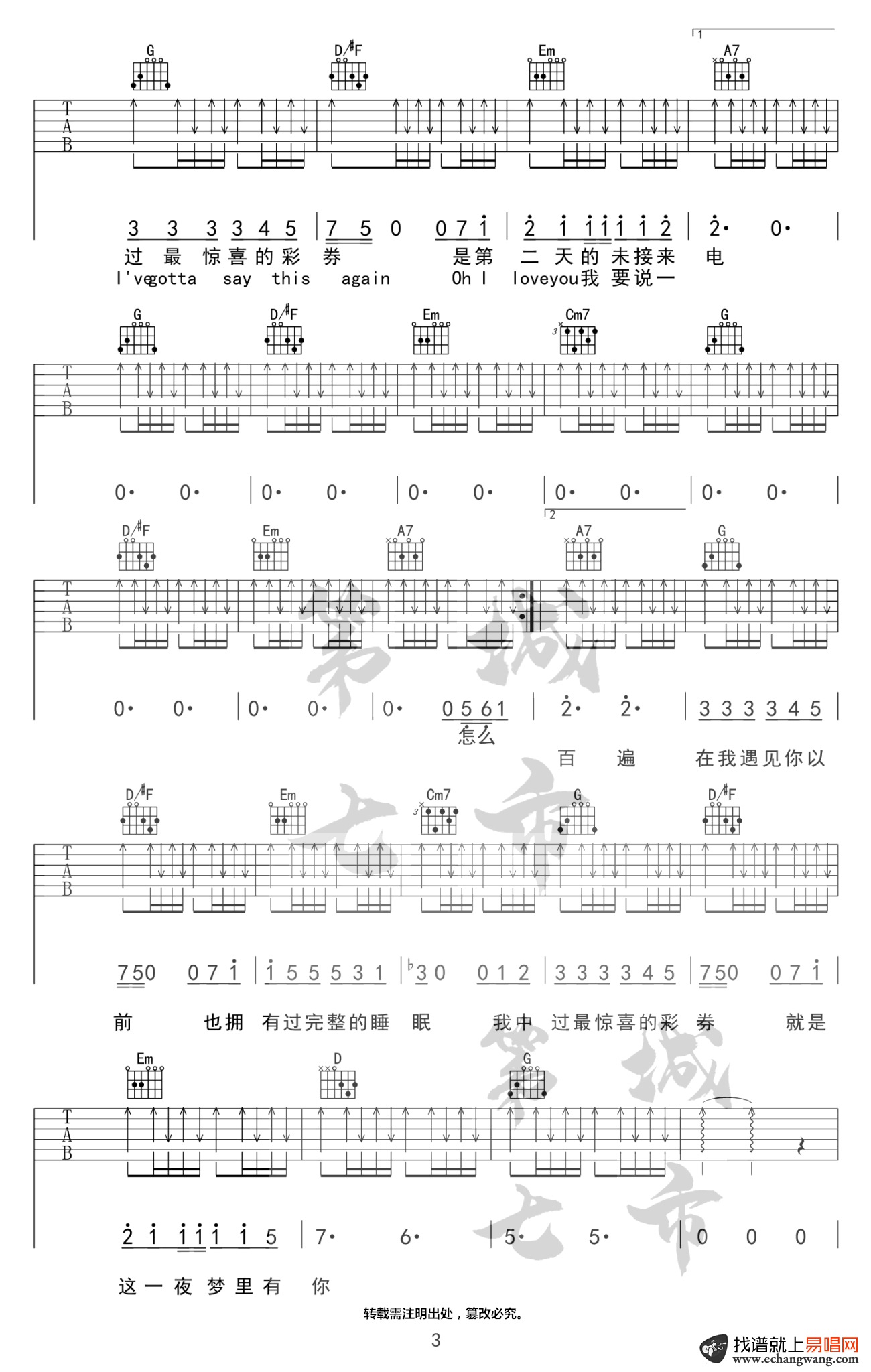 曲谱介绍: 《彩券》吉他谱,薛之谦的一首风格有别于以往歌曲温暖歌曲,彩券吉他六线谱,原调降G,降半音调弦,选用G调指法编配。三张弹唱图片谱由第七城市分享,91吉他谱整理上传。 吉他柔和的旋律,充满温柔的歌词,让整首歌曲都带着甜蜜温馨的情感意境,平淡的生活中我们期待一些令自己怦然心动的小惊喜。 就像彩券中奖的幸运,这种快乐,是与一个人心动神移的相遇,或许也是与一首歌曲心灵契合的应和。