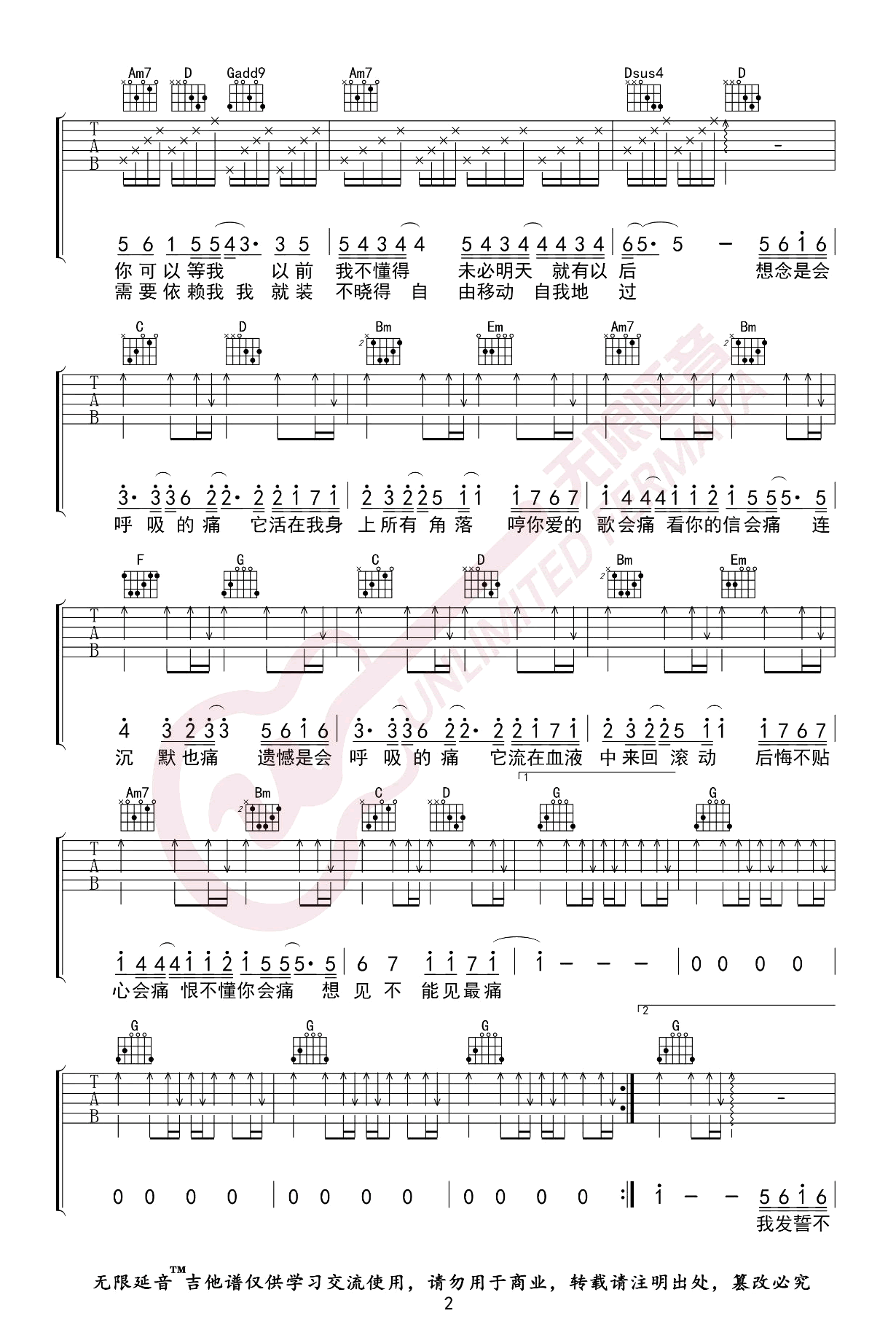 曲谱介绍: 《会呼吸的痛》吉他谱,梁静茹的一首经典的疗伤情歌,用最深的思念传达最悲伤的痛。会呼吸的痛吉他弹唱谱,G调编配,三张弹唱图片谱,无限延音出品。 吉他伴奏纯粹清澈,直接简单的感情表达,深情的歌声句句都是泪点,唱到让人痛彻心扉。时间过去越久,有些人事物反而在记忆里越发翻腾,所谓想念与疼痛,如何才能束之高阁不再感知,好过白白承受牵挂。