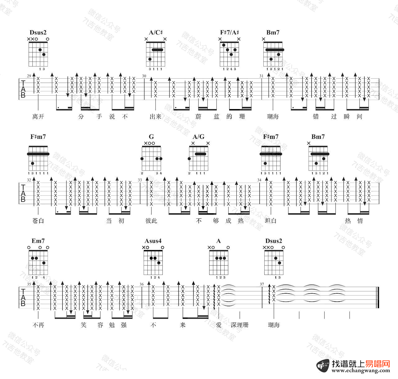 曲谱介绍: 《珊瑚海》吉他谱,周杰伦的一首经典男女对唱情歌,珊瑚海吉他弹唱谱,这首歌的原调是Ab大调,采用D大调的指法来编配。如果想弹原调,需要夹第6品哦。7T吉他制谱分享。