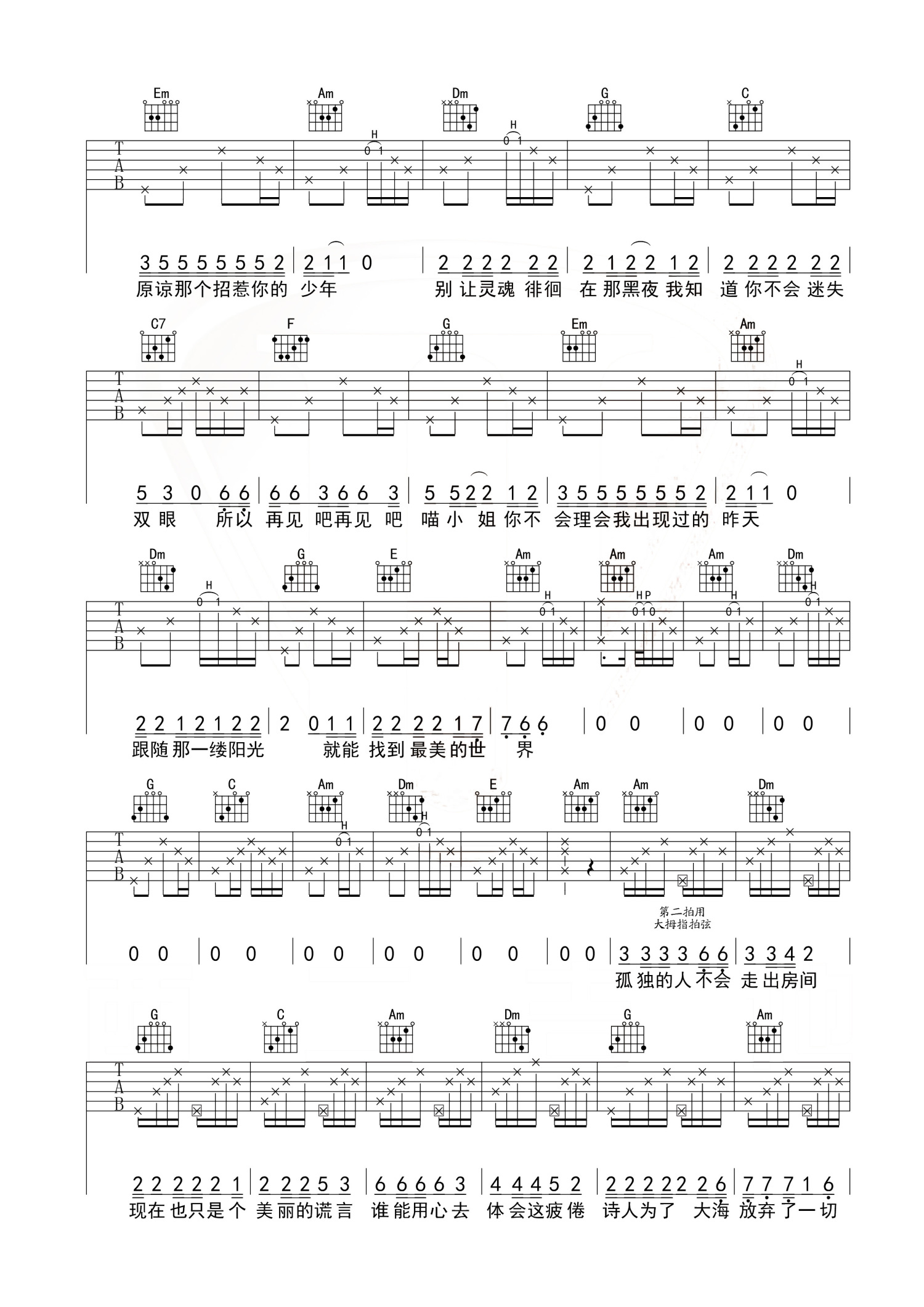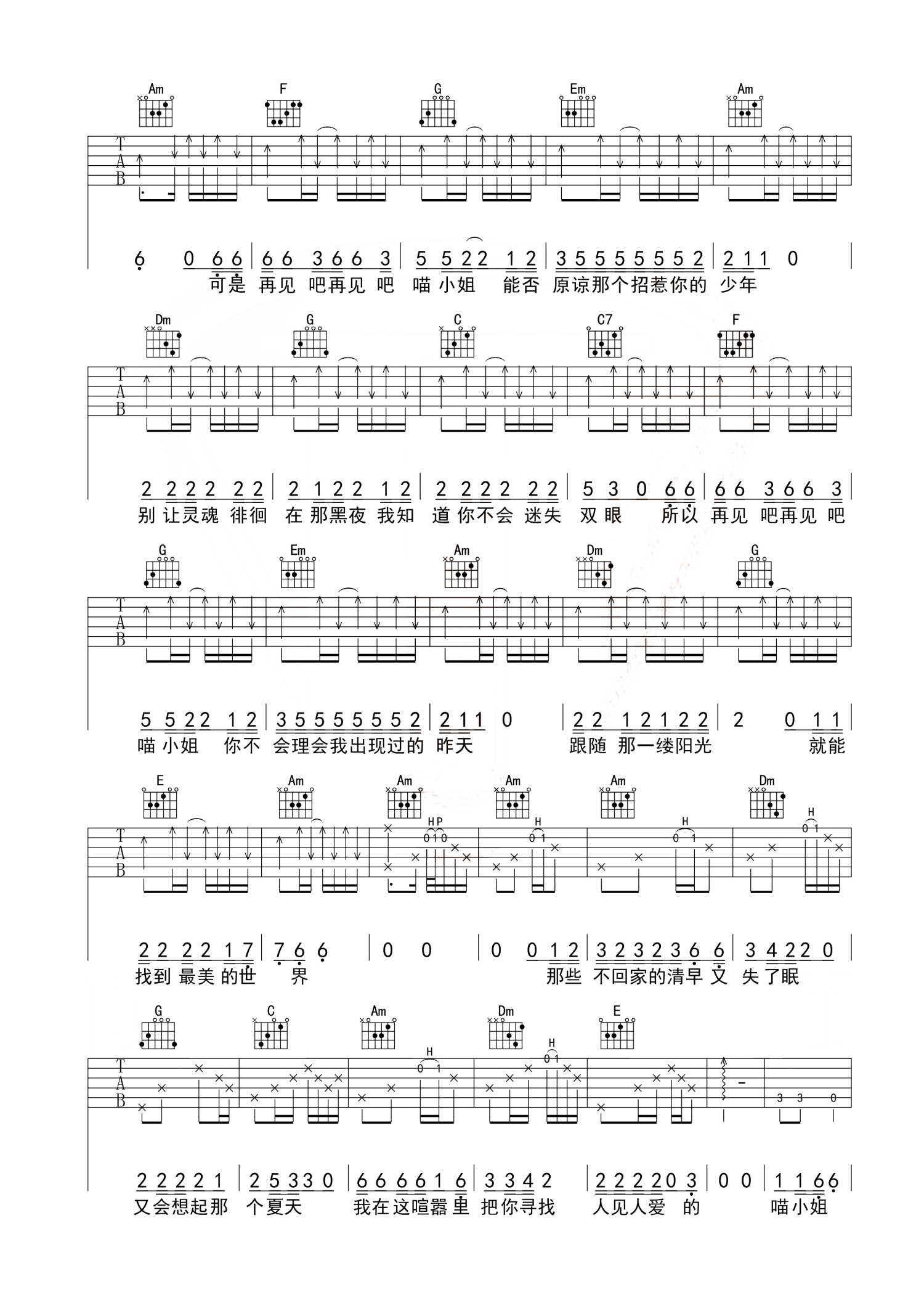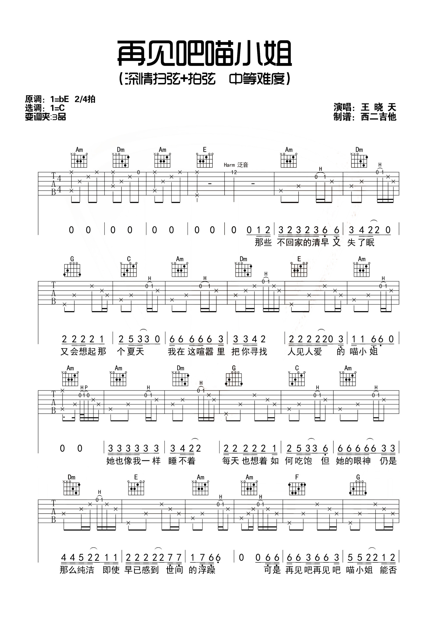 曲谱介绍: 王晓天《再见吧喵小姐》吉他谱_C调吉他弹唱谱