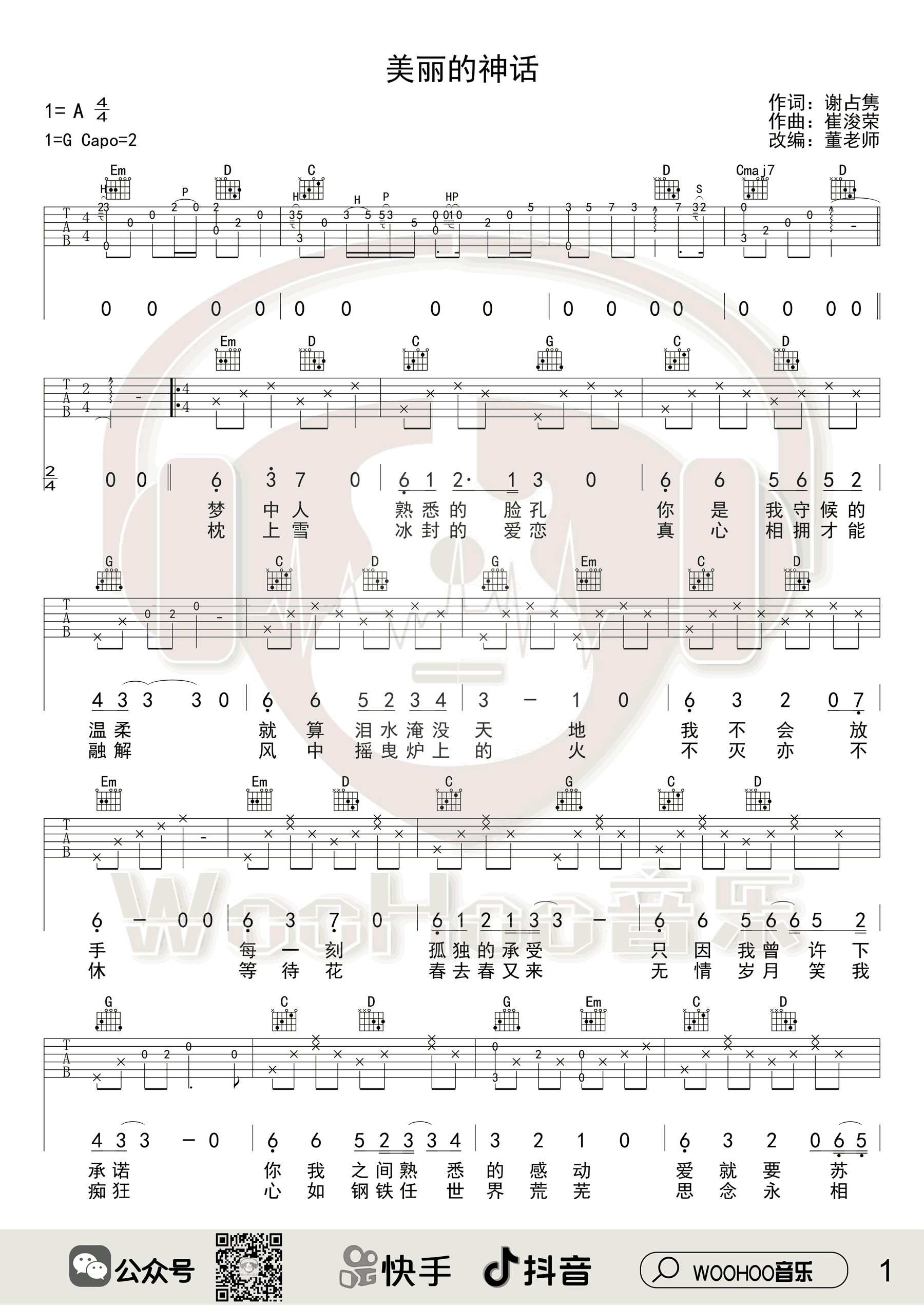 曲谱介绍: 《美丽的神话》吉他谱,韩红孙楠演唱,成龙金喜善主演的电影《神话》主题曲,美丽的神话六线谱,原调A选用G调,CAPO夹二品,董老师编配分享。 一首细腻又哀愁的歌曲,宛转悠扬的旋律感人至深,带我们穿越千年,再次忆起那一段刻骨铭心的旷世爱情。