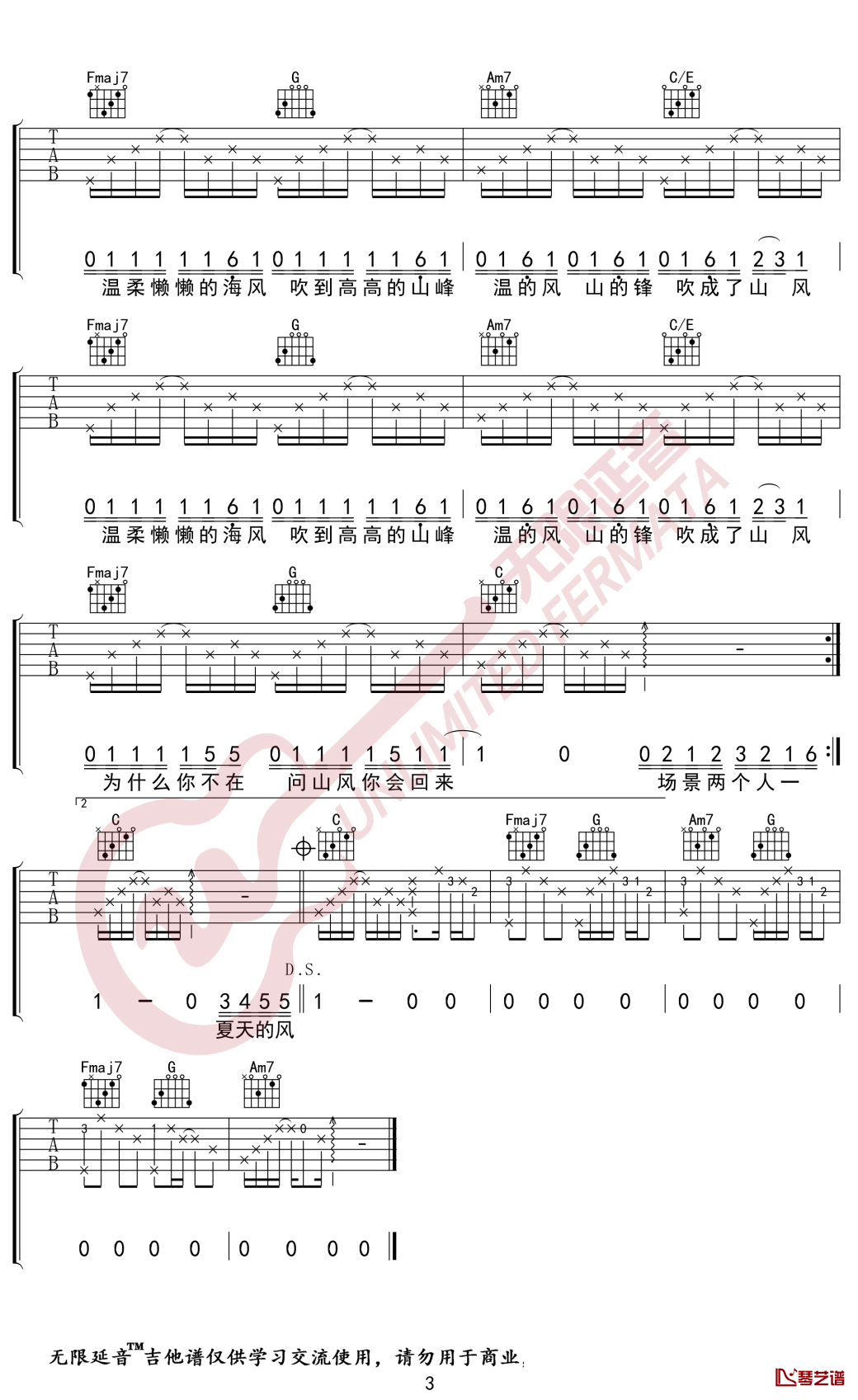 曲谱介绍: 温岚《夏天的风》吉他弹唱谱,采用G调指法编配,共有3张高清图谱。