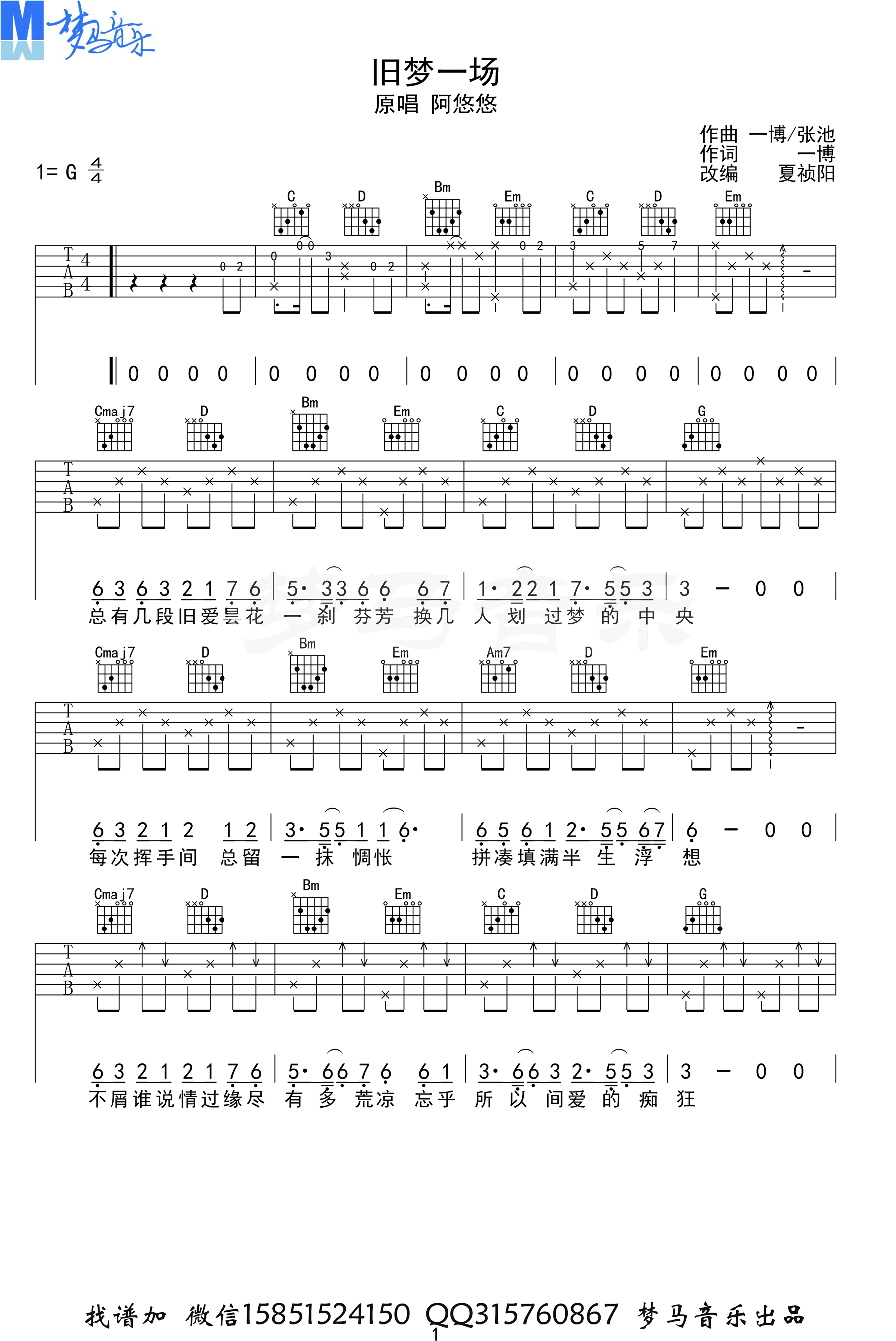 曲谱介绍: 《旧梦一场》吉他谱,阿悠悠演唱的一首伤感苦情歌,旧梦一场六线谱,G调弹唱谱,三张高清图片,梦马音乐编配出品,整理分享。 早知惊鸿一场,何必情深一往。一首全网刷屏的抖音热门歌曲,各种短视频都用它做BGM,绕耳的旋律和节奏动感洗脑,让人听过就很难忘记。弹唱起来也很简单,琴友们拿上吉他练习起来吧。