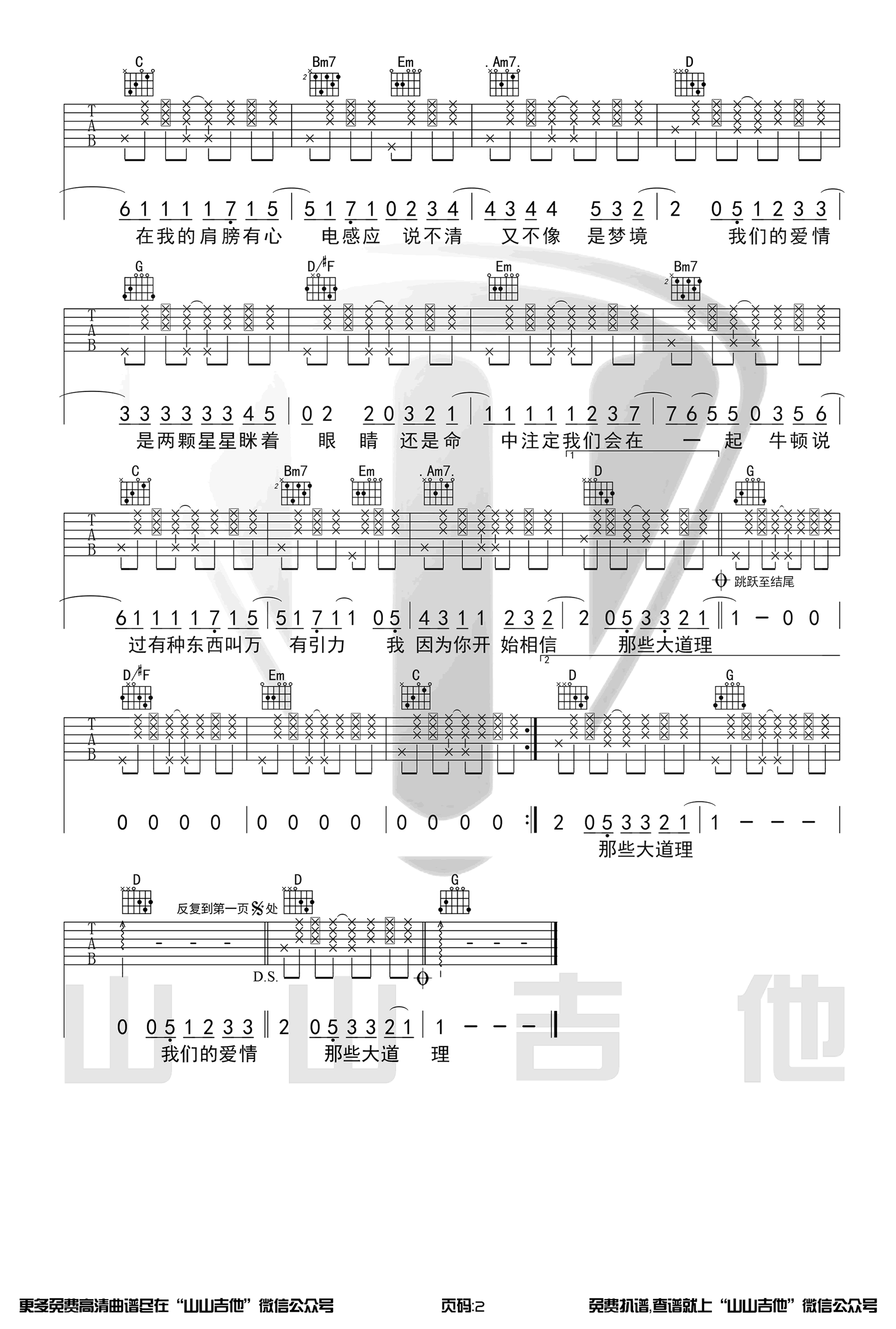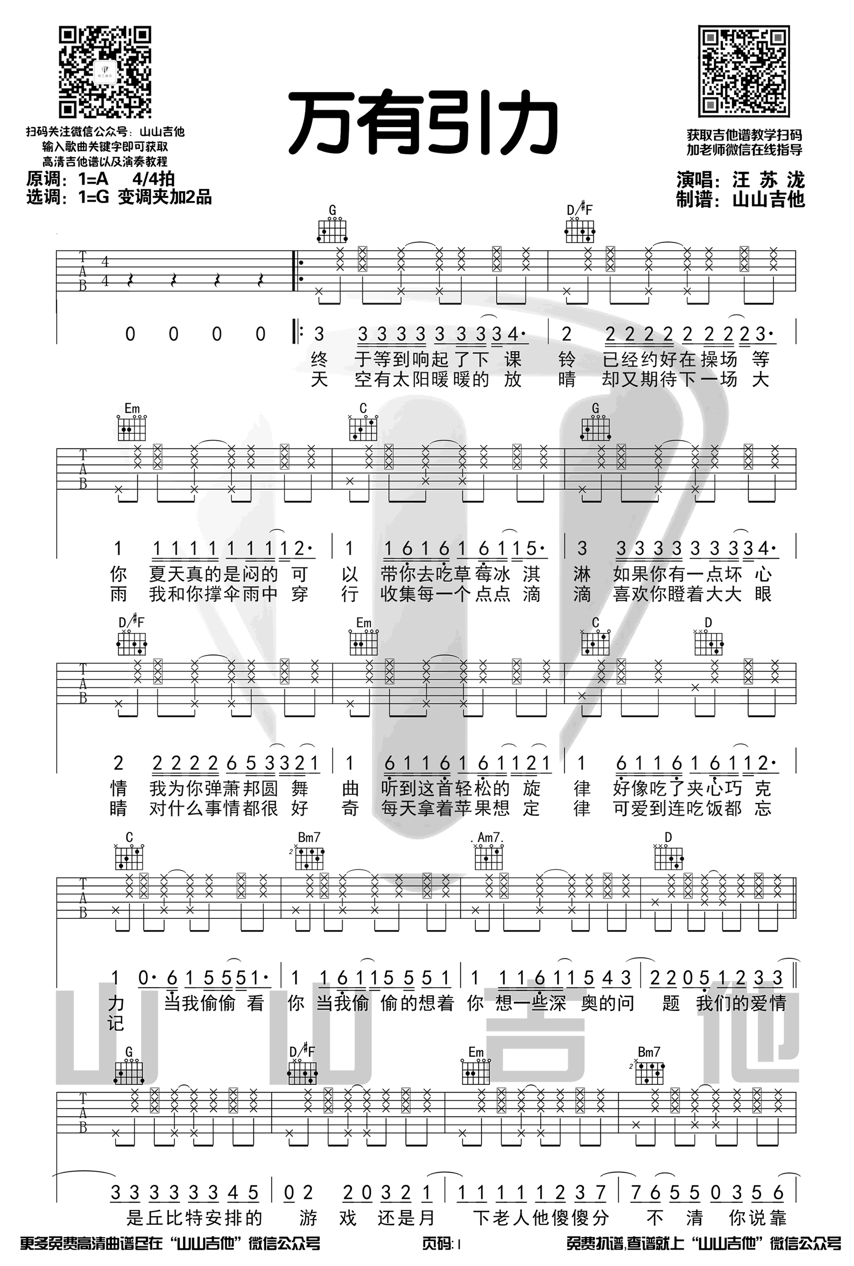 曲谱介绍: 《万有引力》吉他谱,汪苏泷演唱,这首13年发布的歌曲最近又随着抖音重新流行了起来,万有引力六线谱,原调A选调G,变调夹夹二品。两张图片谱高清版,山山吉他编配,吉他谱更新上传。 这首歌包含了众多的音乐风格,如R&B、Funky、Pop、中国风等,虽然风格很多,但被融合的非常完美,不会因为曲风的繁杂而感觉没有统一性。山山老师为大家录制了演示视频,喜欢这首歌的朋友们可以拿起吉他谱练起来啦~